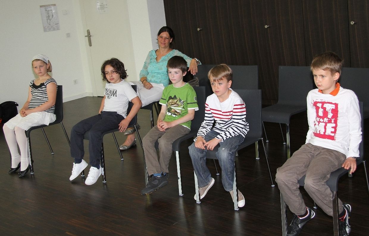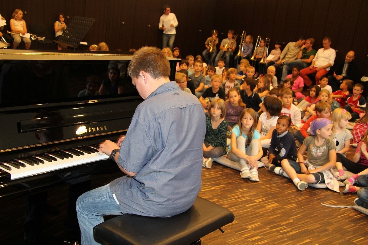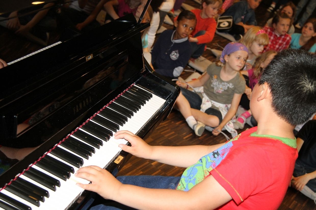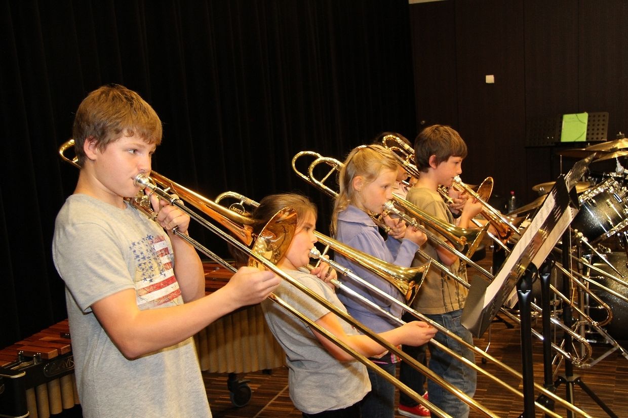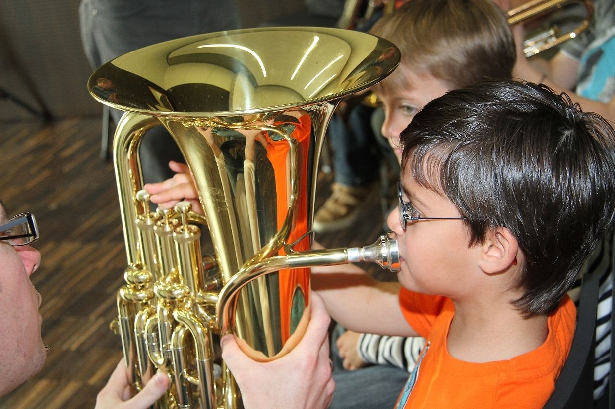 Die Schulkinder der zweiten Klasse aus Mamer konnten sich drei Stationen aus den angebotenen sechs aussuchen. Um die 80 Schüler passierten an dem Tag im Kulturzentrum. 20 Minuten waren vorgesehen pro Workshop in denen die Kinder die Möglichkeit hatten die verschiedenen Instrumente kennenzulernen, sie anzufassen, anzuhören und darauf zu spielen. Hoch im Kurs lag der in diesem Jahr neu angebotene Schlagzeugkurs, doch auch die Elektro-Guitarre und die Blasinstrumente waren beliebte Ziele der vielleicht angehenden Musiker.