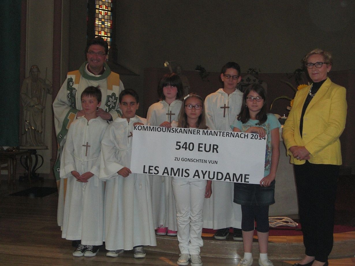Am Kader vun enger Kannermass zu Lelleg hu vru kuerzem d'Kommiounskanner aus der Gemeng Manternach e Chèque vun EUR 540,- un den Deche Claude Bache iwwerreecht, dee Prësident ass vun der ONG "Les Amis Ayudame Luxembourg". Mat deene Sue wollten d'Kommiounskanner hir Freed mat deene Kanner aus Brasilien deelen, deenen et net esou gutt geet, wéi hinne selwer. Den Dechen huet - a Begleedung vun der Vize-Prësidentin Josée Stumper-Majerus - de Kommiounskanner an hiren Elteren e grousse Merci fir hir Genorositéit gesot an hinnen unhand vun engem Diasmontage gewisen, wou hir Suen investéiert ginn. D'ONG ënnerstëtzt zënter enger Rei vu Joren eng Schoul am CEIFAR (Centre d'intégration familiale) en engem vun deenen äermste Quartierë vu Salvador de Bahia/Brasilien. An där Schoul, déi vun enger belscher Coopérante, de Simonne De Bouck gegrënnt gouf, sinn iwwer 300 Kanner ageschriwwen, déi nierft enger schoulescher Ausbildung och medezinesch versuergt ginn. Ganz grouss geschriwwe gëtt do och déi musikalesch Formatioun, an d'Schülerinnen an Schüler fannen dacks iwwert d'Musek an dem Danz hire Wee an d'Liewen.(C.B)