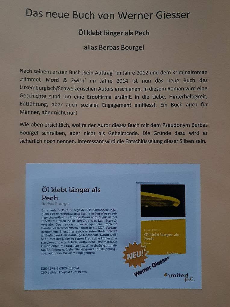 Manternach Neues Buch unter meinem Pseudonym Berbas Bourgel: Öl klebt länger als Pech Werner Giesser 2 Bildergalerie Bitte scrollen Sie nach unten,um weitere Bilder zu sehen. Veröffentlicht am Mittwoch, 5. Januar 2022 um 17:39 Hierberwee, Manternach, Luxemburg Hinweis auf meinen aktuellen Roman unter dem Pseudonym Berbas Bourgel erhältlich bei Ernster, aber auch bei Amazon; einige wenige signierte Exemplare noch beim Autor. Siehe auch Video https://fb.watch/9e8NsBhJZC Unpassenden Inhalt angeben Weitere Neuigkeiten von Werner Giesser > La nuit du polar - Kriminacht 29.03.25 Kahler Mein neues Buch 'Die Gutland-Morde' beim Baobab Verlag unter crime.lu 15.11.23 Walferdingen Aueren - Uhren - montres - watches 28.02.20 Berburg Werner Giesser anlässlich seiner Lesung in der Mediathek in Wasserbillig 06.10.14 Wasserbillig Regierungsbildung(en) 16.12.13 Berburg