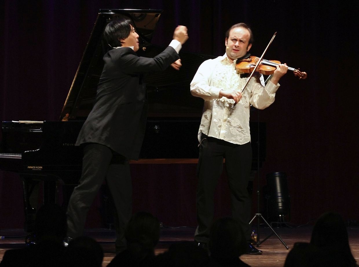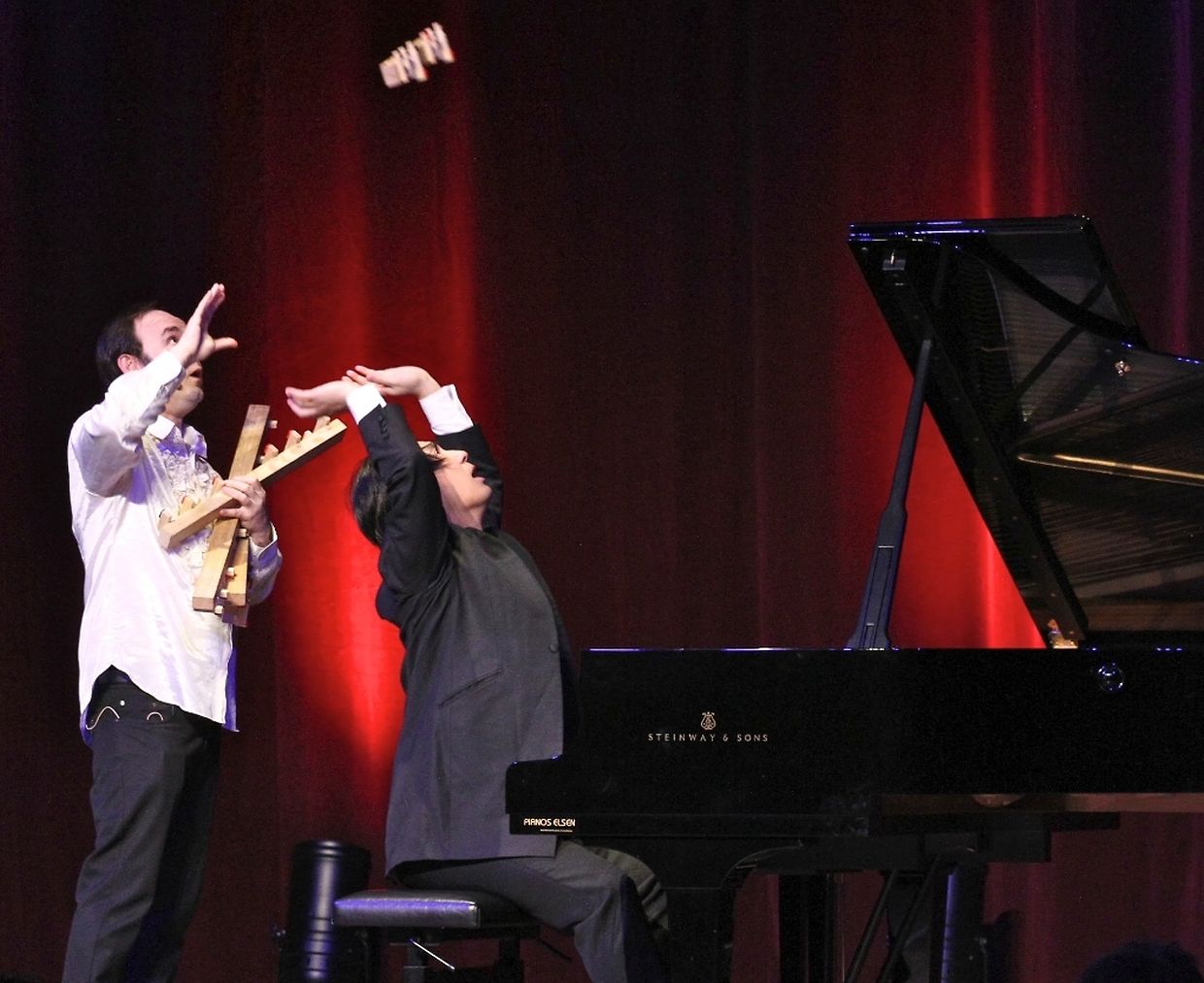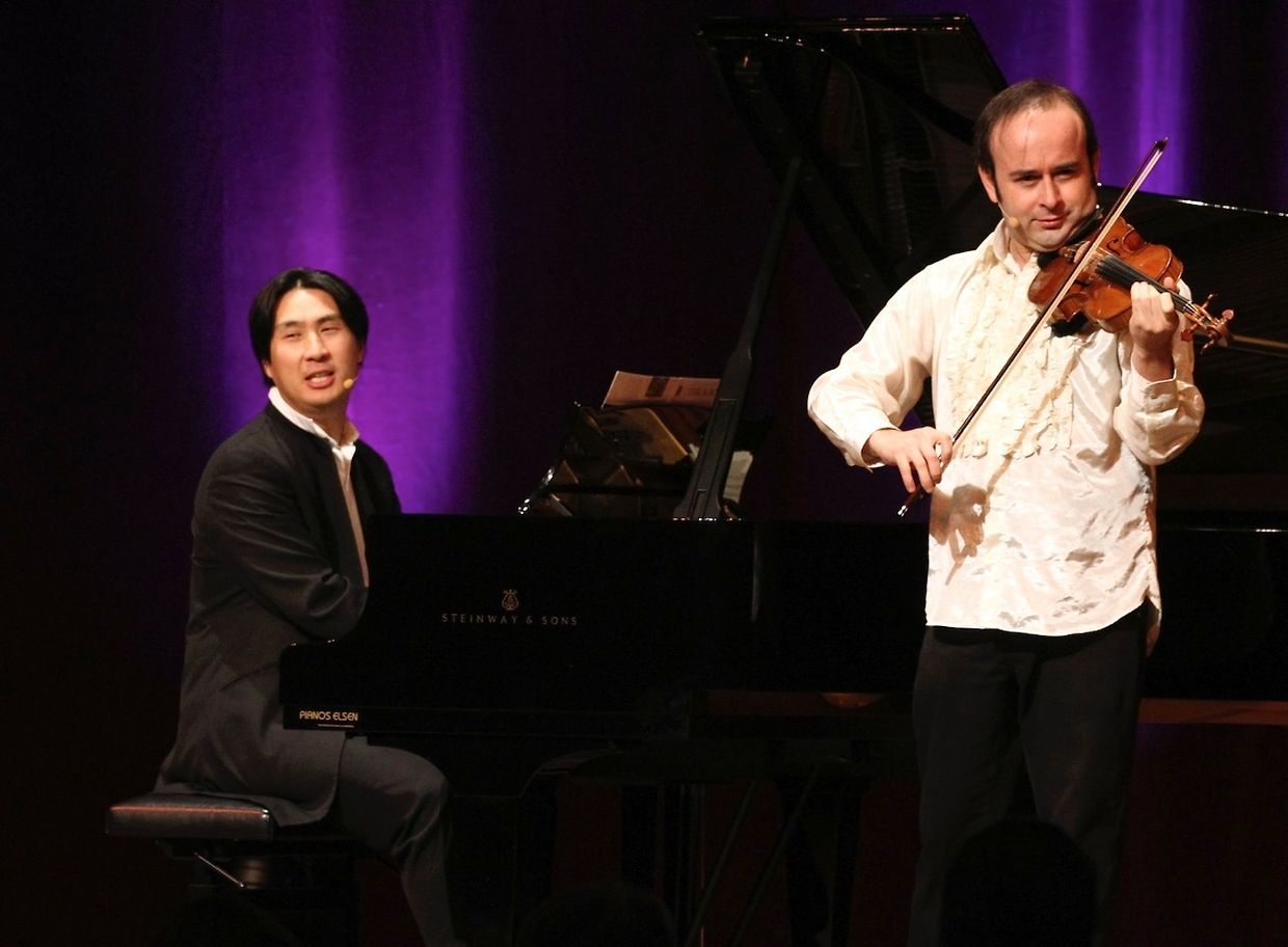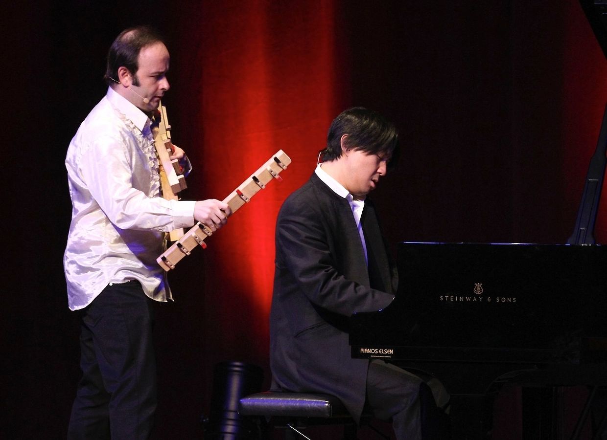 Wer sich bis dato eingebildet hatte, dass der 1. Satz von Mozarts Sinfonie Nr. 40 keinesfalls geeignet sei, als Titelmelodie von James Bond zu fungieren, wurde am Samstagaben in Marnach eines besseren belehrt. Nichts scheint unmöglich in den Augen der beiden Künstler. Da wird kurzerhand der Beatles Song „Ticket to Ride” zur barocken Koloraturarie und endet zur allgemeinen Begeisterung in schrillen kubanischen Rythmen. Selbst Rachmaninov´s Prelude in C-Sharp Minor, Op 3, No. 2, die anfangs an den kleinen Händen des Pianisten Joo zu scheitern drohte, wird letztendlich doch noch mit Bravour und diversen hölzernen Hilfsmitteln zum wahren Ohrenschmaus.