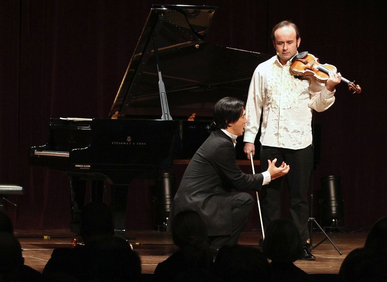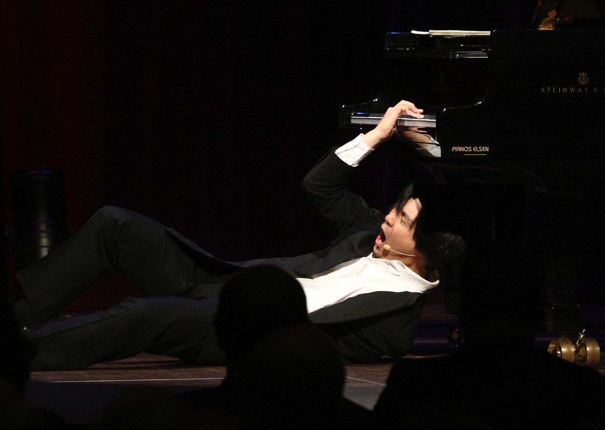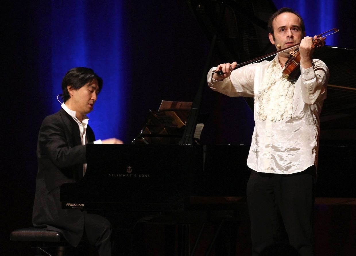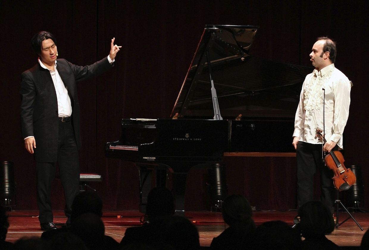 Wer sich bis dato eingebildet hatte, dass der 1. Satz von Mozarts Sinfonie Nr. 40 keinesfalls geeignet sei, als Titelmelodie von James Bond zu fungieren, wurde am Samstagaben in Marnach eines besseren belehrt. Nichts scheint unmöglich in den Augen der beiden Künstler. Da wird kurzerhand der Beatles Song „Ticket to Ride” zur barocken Koloraturarie und endet zur allgemeinen Begeisterung in schrillen kubanischen Rythmen. Selbst Rachmaninov´s Prelude in C-Sharp Minor, Op 3, No. 2, die anfangs an den kleinen Händen des Pianisten Joo zu scheitern drohte, wird letztendlich doch noch mit Bravour und diversen hölzernen Hilfsmitteln zum wahren Ohrenschmaus.