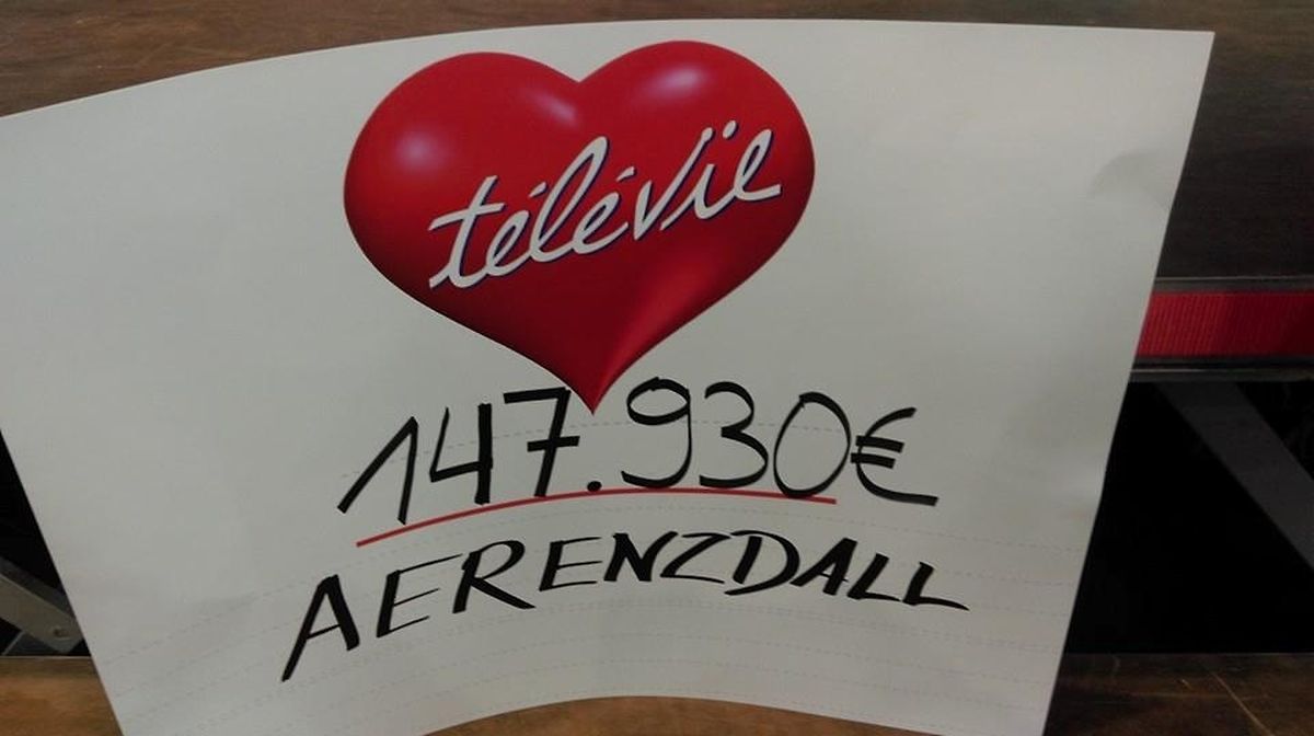 Um 19:00 Auer war du d’live Iwwerdroung op RTL Fernseh wou mer den “chèque final” vun der Aerenzdallgemeng konnten präsentéieren : 147930 euro