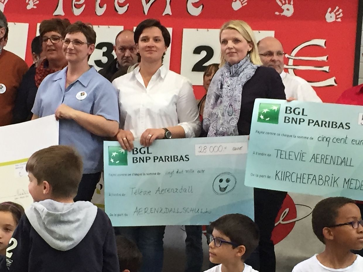 D’Schecken vun allen Organisatiounen am Laaf vum Joer hun eleng 88338 €uro erabruecht, den déckste Scheck war vun der Aerenzdallschull mat sagenhaften 28000.- €uro, déi d’Schoulkanner an d’Léierpersonal gesammelt hun mat Aeppeljusverkaaf, hieren Chrëschtmaart, e Bichermaart, e Concert mam Männerchouer aus dem Mëllerdall, bezuelt Laafen rondrëms den Fussballsterrain, an eng CD mat Lidder, déi se selwer geschriwwen an gesongen hun. Si hun dëss Lidder och virgedroen am spéide Nomëtteg, dat war én vun den gréissten Highlights vum Dag.