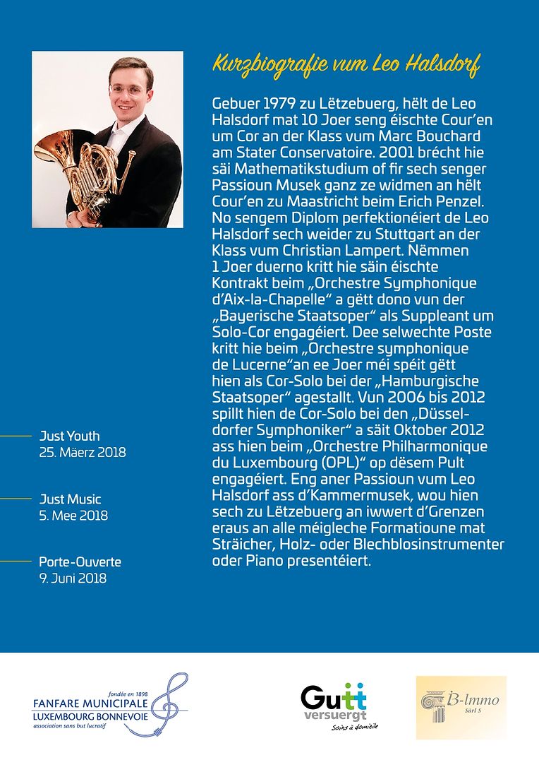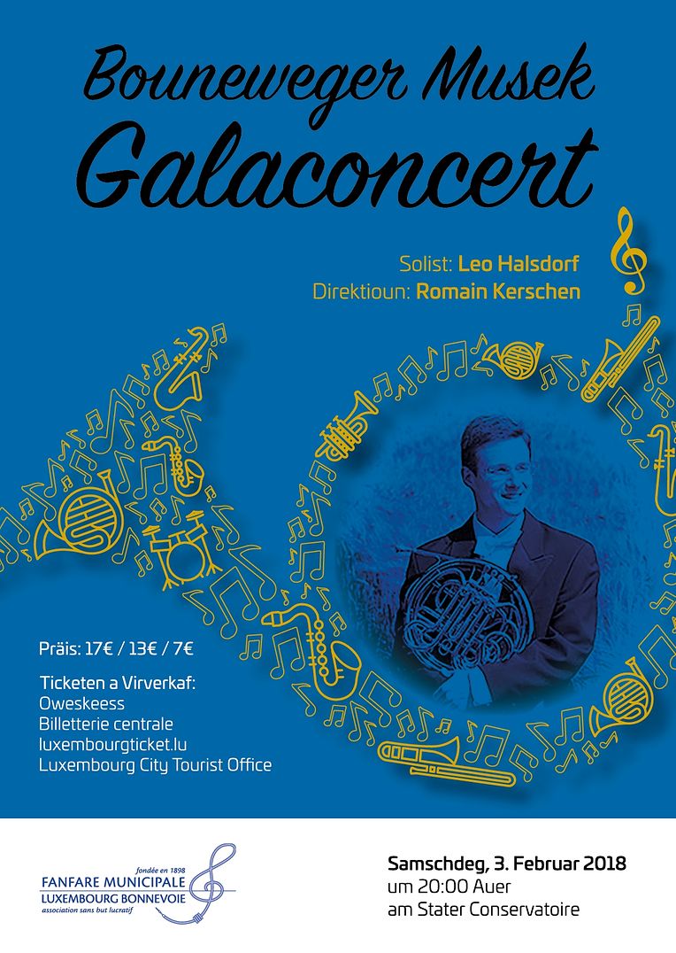 Gala-Concert 2018 der Fanfare Municipale Luxembourg-Bonnevoie mit dem luxemburgischen Solist Leo Halsdorf auf dem Horn. Die Fanfare Municipale Luxembourg-Bonnevoie lädt ein zu ihrem Galakonzert im Konservatorium Luxembourg, am Samstag den 3. Februar 2018 um 20h00. Unter der Leitung von Dirigent Romain Kerschen spielt die Fanfare klassische und moderne Werke u.a. von Dimitri Shostakovich, Johan de Meij und Paul Lovatt-Cooper. Star des Abends ist der luxemburgische Hornist Leo Halsdorf (Mitglied des renommierten „Orchestre Philharmonique Luxembourg“), der als Solist das Horn Konzert N°2 von Mozart vorführt, sowie zusammen mit dem Bonneweger Hornist Marc Haustgen das Werk „Dialogues pour 2 cors“ des Luxemburger Komponisten Marco Pütz. Eintrittskarten: Telefon 470895-1 (luxembourgticket.lu): 17/13/7-€. Wir freuen uns auf sehr über ihren Besuch.