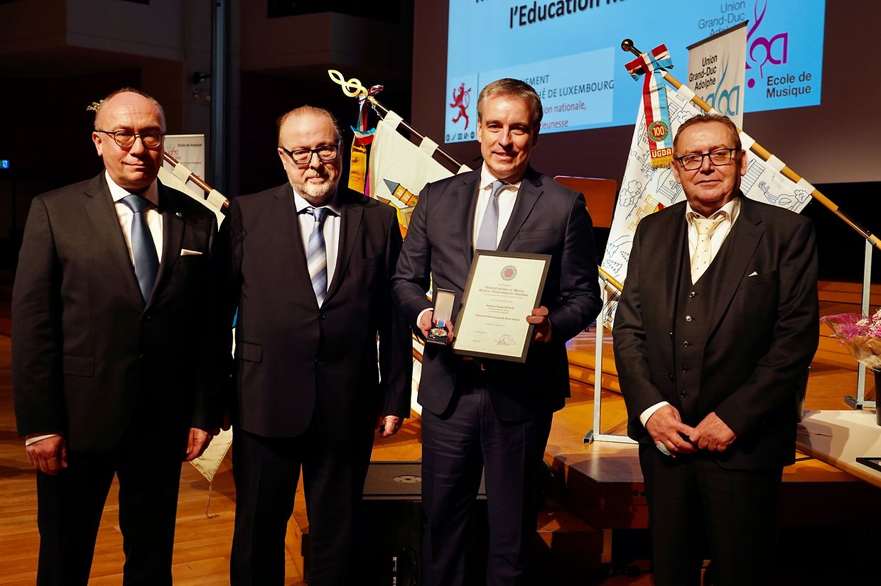 Après la cérémonie en l’honneur des membres méritants de la Fédération, la médaille européenne du grade d’Officier de l’Ordre Européen du Mérite Musical a été remise au Ministre de l’Education nationale Claude Meisch en remerciement de ses grands mérites en faveur de la Loi sur la gratuité de l’enseignement musical.