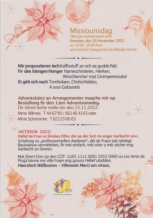 Luxemburg - Merl Missiounsdag vun den Amis de Pirajà, den 20.11.2022 Gaby Schmitz Veröffentlicht am Montag, 7. November 2022 um 14:37 Märel, Lëtzebuerg, Luxemburg Les Amis de Pirajà invitéieren op hire Missiounsdag, dëst Joer ausnamsweis schonn den 20.11.2022 am Home St Gengoul zu Märel, vun 14.00 bis 20.00 Auer Unpassenden Inhalt angeben
