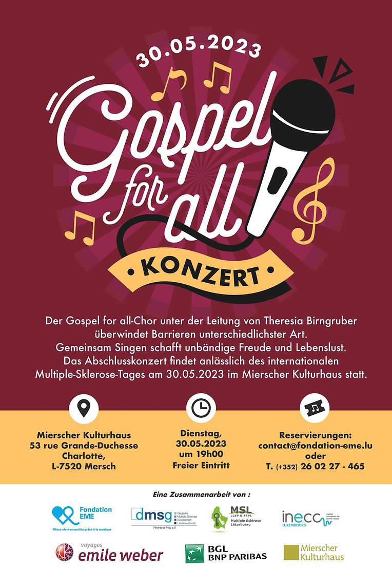 Le concert de chorale aura lieu le 30 mai 2023, à 19h, dans le cadre du projet 'Gospel for all'. Il se tiendra au Mierscher Kulturhaus et est l'objet d’une collaboration avec INECC Luxembourg, Deutsche Multiple Sklerose Gesellschaft Trier, et Mulitple Sclérose Lëtzebuerg.