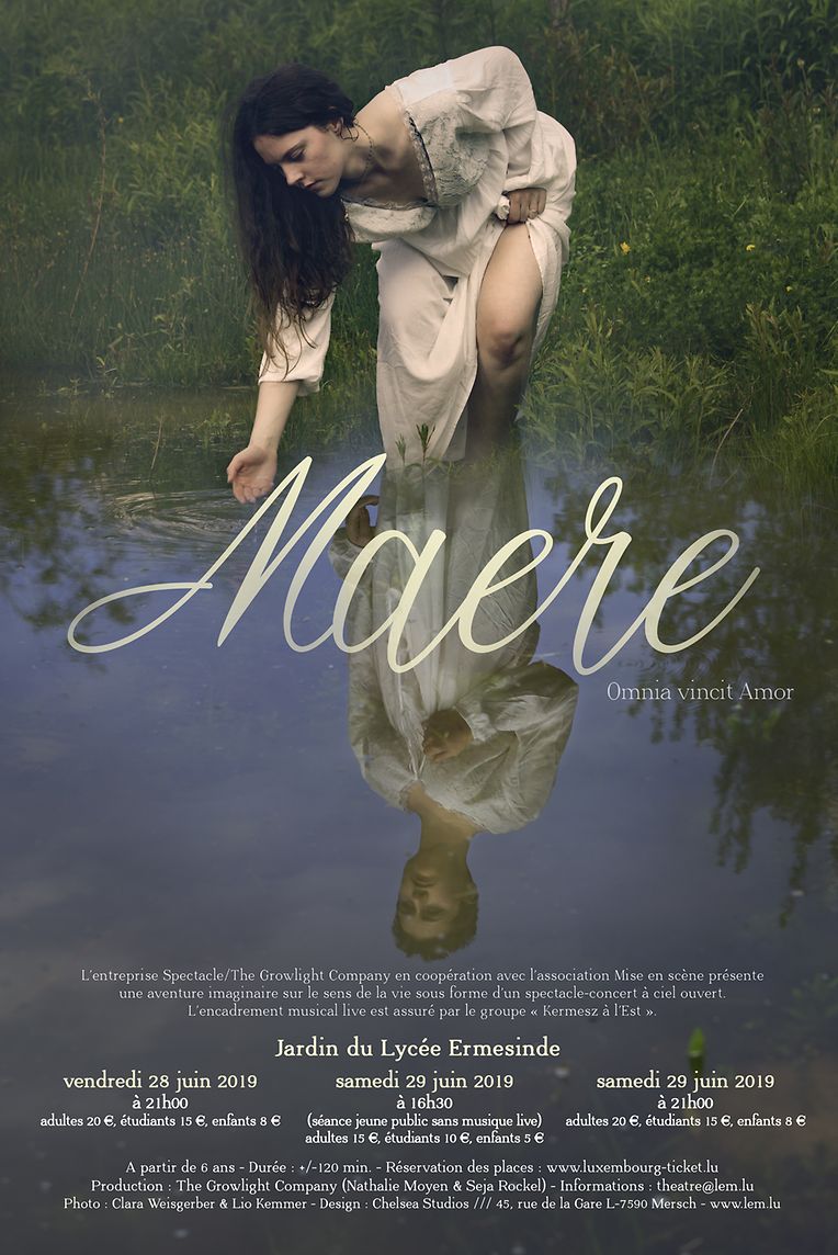 L’entreprise Spectacle/The Growlight Company du Lycée Ermesinde en coopération avec l’a.s.b.l. Mise en scène présente Maere (Omnia vincit Amor), une aventure imaginaire sur le sens de la vie sous forme d’un spectacle-concert à ciel ouvert vendredi 28 et samedi 29 juin 2019 au Lycée Ermesinde à Mersch. L’encadrement musical live est assuré par le groupe « Kermesz à l’Est ».