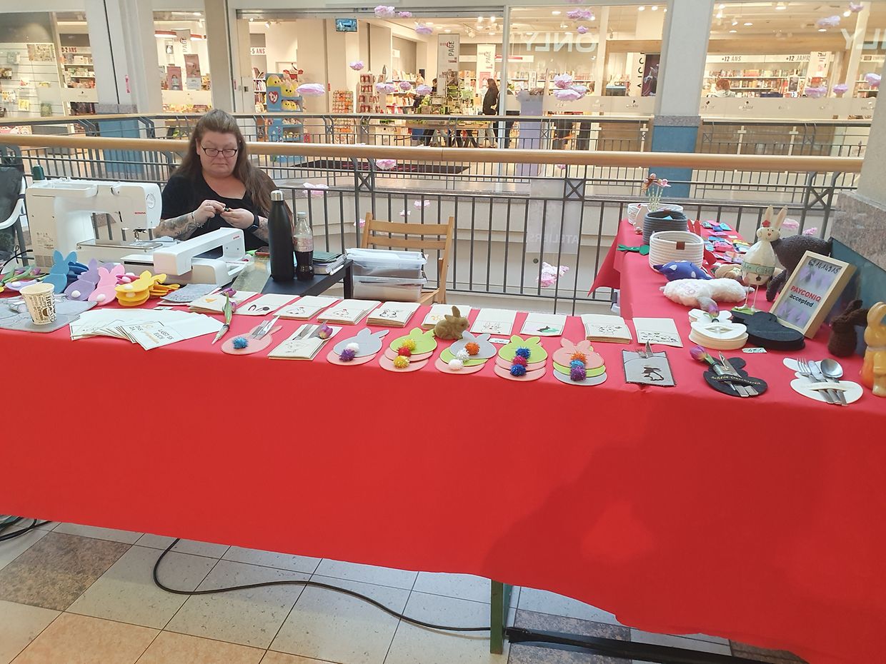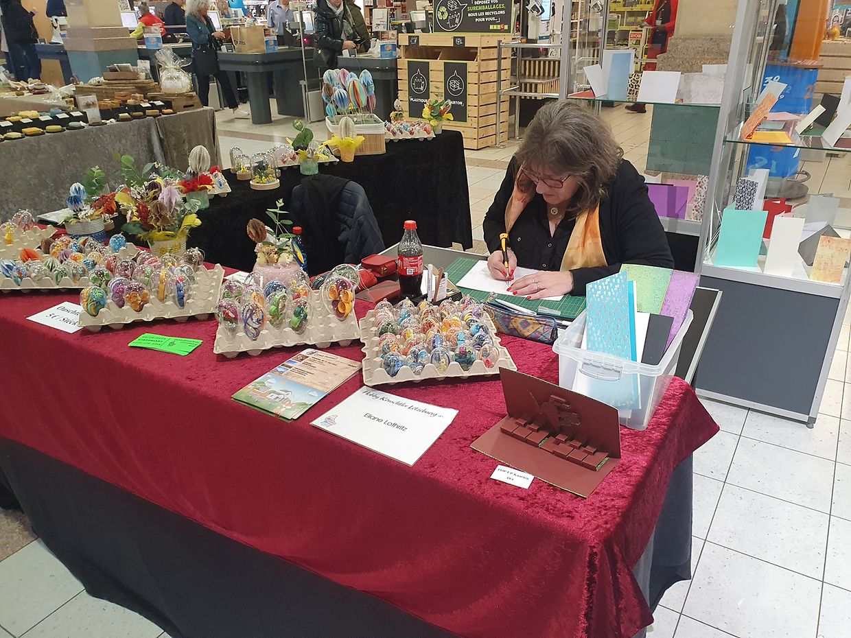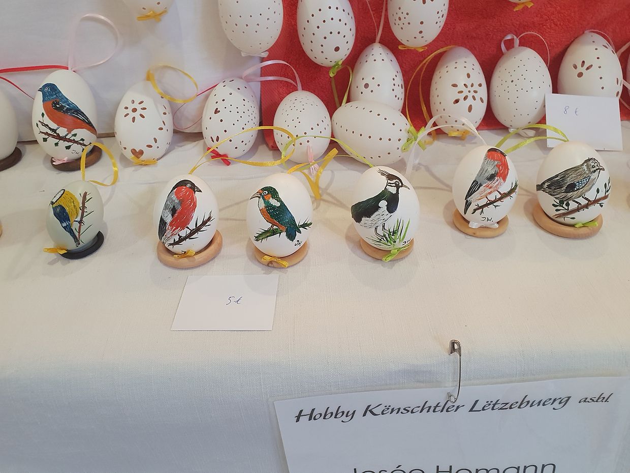 Ënnert anerem gebastelt Ouschtersaachen, Ouschterhuesen, Kränz mat Blumme fir un d'Dieren, vill Artikelen am Haarz, Holzspillsaachen, Gelasert a matt Ledluuchte beliichten Deko Géigestänn, kleng Heemdekoratiounsartikelen aus Holz oder Sperrholz, Keramik, gemoolten Héngereeër, Gänseneeër a Strausseneeër, Seefen aus Naturprodukter, gehäkelt Saachen, Konscht aus Pabeier, Klëppelen, Bicher, handgemaachte Käerzen, Schofsfell, peintures d'oiseaux sur coquilles d'œufs, Kaarten fir all Geleeënheeten, Bijoue mat Natursteng asw.