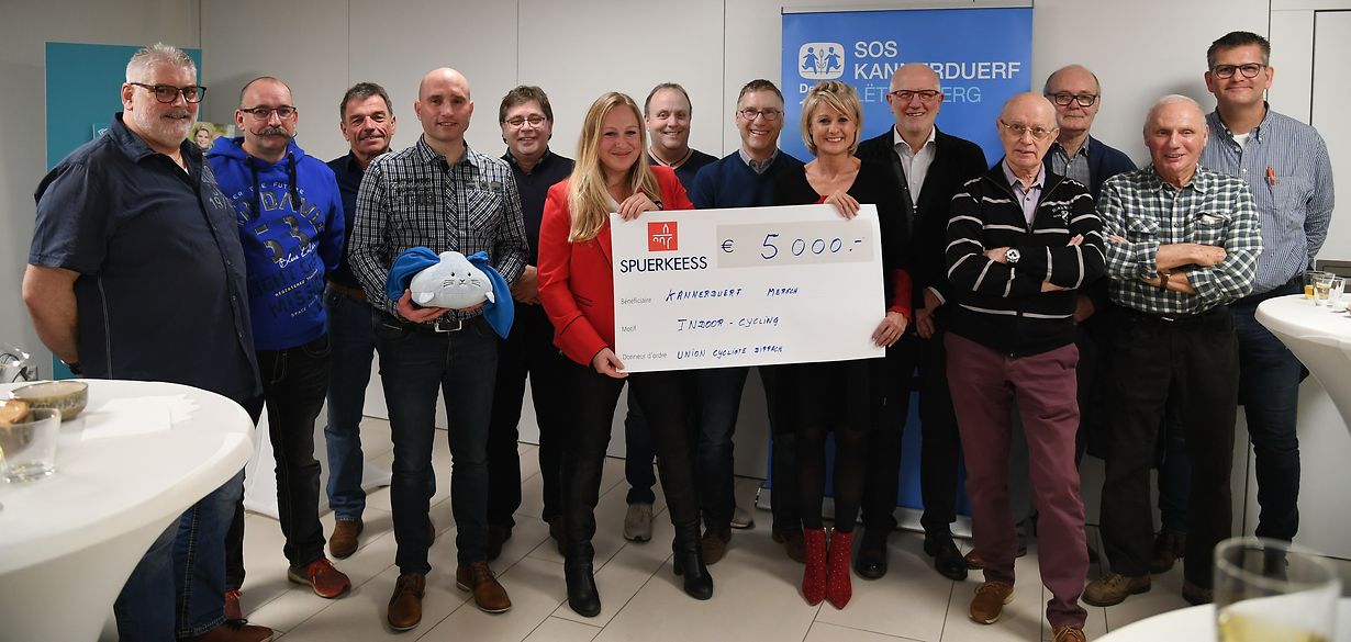 Mersch: Wenige Tage vor dem Weihnachtsfest überreichte die Union Cycliste Dippach" den Erlös ihrer 7. Auflage des im November organisierten „ Charity Indoor Cycling“ auf Krounebierg, in Form eines Schecks über 5 000 Euro an das SOS Kannerduerf Lëtzebuerg. Eingangs ging Vereinspräsident Henri Jungels auf die Geschichte sowie auf die positive Entwicklung des seit 1935 bestehenden Fahrradsportvereines mit seinen 56 lizensierten- unter ihnen vier Profifahrer der höchsten Liga-, ein. Als Vereinsvorsitzender bedankte dieser sich nachträglich noch einmal bei allen 153 Fahrradteilnehmern die beim diesjährigen Event mit sportlichem Charakter aktiv dabei waren, bei der lokalen Sportkommission sowie bei allem Fördern, ohne die eine solche große Veranstaltung nicht möglich gewesen wäre. So bedankte sich Cynthia Conzemius, administrative Direktorin im SOS Kannerduerf Lëtzebuerg für die großzügige Spende und unterstrich die Notwendigkeit solcher finanziellen Unterstützungen. Dieses Geld wird dazu eingesetzt werden, um zukunftsweisende Projekte zugunsten der benachteiligten Kinder im Kinderdorf zu finanzieren, wo derzeit rund 165 Mitarbeiter sich um rund 400 Kinder, die entweder stationär in einem der Häuser untergebracht sind oder ambulant betreut werden, kümmern und aus unterschiedlichen Gründen nicht in ihren Familien leben können. www. kannerduerf.lu (TEXT/FOTO: CHARLES REISER)