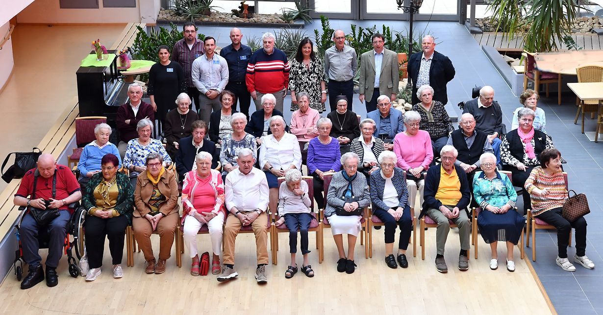 Miersch: Eng Gebuertsdagsfeier soll ëmmer mat Freed verbonne sin, an och a gudder Erënnerung bleiwen. Dat huet bei der zweeter Feier fir dest Joer am „Home St Joseph Miersch“ zu honnert Prozent zougetraff. Et war einfach formidabel wi Direktioun zesummen mat de Leit vum „Club R“ a Pensionnären während e puer Stonnen sech ganz gut amuséiert hun. De Rol Girres als Entertainer hat mat sengem gewinnten Humor och fir bëscht Stëmmung am schéi gerëschte Saal gesuergt. Och d’Gemengevertrieder vu Bissen, Colmer- Bierg, Lëntgen, Fiels a Miersch, vertrueden duerch Carlo Mulbach, Isabelle Wickler, Jos Consbrück, Nico Dahmen, Christiane Haubrich a Willy Vullers waren mat vun der flotter Party. Houffrig war den Direkter Nicky Wintringer mat sengen Responsabelen vum Haus, Sandrina Alves, Laurent Paul, Thomas Eibel mat der Schwëster Paule Detampel fir allen 34 Jubilaren, déi zëschent dem 27. Januar an dem 27. Abrël Gebuertsdag feieren konnten, di allerbëscht Gléckwënsch ze iwerbrëngen an hinnen all zesummen mam Team eng Rous zum Éierendag ze schenken. Natirlich huet de grousse Gebuertsdagskuch mat engem Glas Crémant och nit bei desem schéinen Event gefeelt. Folgend Jubilaren koumen zu Éieren: Carlo Urwald an Catherine Altmann- Schlechter (73 Joer); Zdzislaw Wypchal (76); Emilie Schmit – Schiltz (77); Marianne Ludivig-Pick an Catherine Ewertz- Schartz (79); Adelie fAber, Liliane Schumacher- Reding an Georgette Zenners- Koeune (81); Annette Stelmes-Groos, Gilbert Godart, an Gisela Schmidt- Fusenig (85); Sr. Paule Detampel an Emile Schloeder (86); Catherine Petit- Bourg an Eugénie Sabel- Schartz (88); Sr. Nicole- Marie Zahnen (89); Ketty Jacobs- Leiner, Sr. Agnes Everad , Margot Lavina- Kousmann an Gertrude Faber- Heyen (90); Charlotte Baustert- Krausch (91); Léonie Koener-Moris, Léon Hoffmann, Cécile Schleimer- Meres, Léon Kayser an Alice Gantrel- Decker (92); Lisa Schwatz- Grof an Yvonne Birscheidt-Birtz (94); Marie Bové- Ewert an René Feltes(95); Sr. Marie- Jeanne Raas an Irma Müller- Wolsfeld (96) ; Catherine Heisbourg-Soisson (98). (CR) (Foto: Charles Reiser)