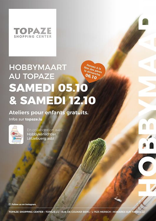 An gleich zwei Samstagen, nämlich dem 5. und 12. Oktober, laden die Hobbykënschtler Lëtzebuerg asbl zum Hobbymarkt auf den Mierscherbierg ein. Im Innenbereich des Shoppingzentrums Topaze bieten zahlreiche Hobbykünstler von 09:00 bis 19:00 handgemachte Geschenke unter anderem aus Keramik, Stoff, Beton, Papier, Eisen und Holz an. Wer also auf der Suche nach einem passenden Geschenk für Vatertag ist oder schon gerne ohne Stress im Voraus Weihnachtsgeschenke für Groß und Klein besorgen möchte, der ist hier an der richtigen Adresse. Wieso also nicht vor dem lästigen Einkauf in aller Ruhe durch die Gänge des Shopping Zentrums spazieren und sich die Handarbeiten mit Herz der Hobbykünstler ansehen?