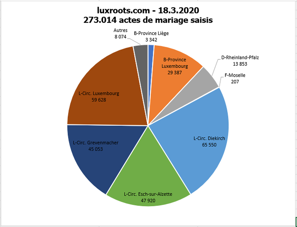 Mehr als 94% der Heiratsurkunden für denselben Zeitraum sind erfasst. Es verbleiben rund 13.000 Urkunden aus folgenden Pfarreien: Moutfort, Oetrange, Sandweiler, Weiler-la-Tour, Beckerich 1616-1673, Hollerich, Luxembourg-Saint-Nicolas 1601-1749, Luxembourg-Saint-Michel 1649-1749, Luxembourg-Garnison.