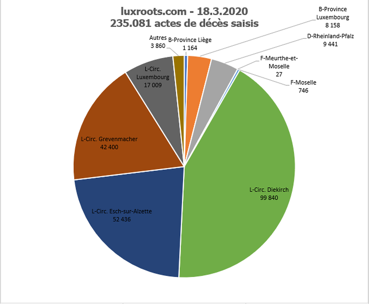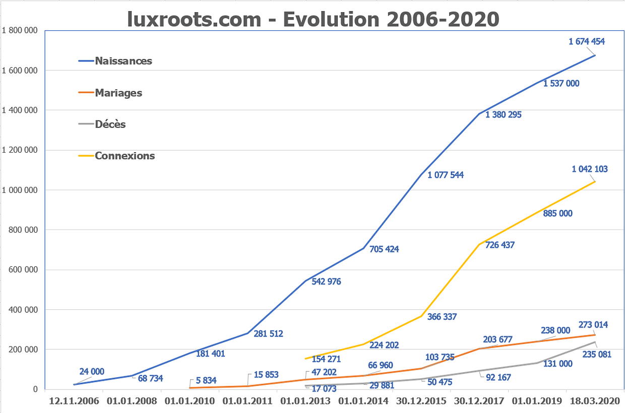 Sehen Sie sich den Fortschritt des luxroots-Projektes an. Schauen Sie sich unsere Grafiken an über die Entwicklung unseres Projektes 2006-2020 sowie über die Verteilung nach Regionen der erfassten Geburten, Heiraten und Sterbefälle.