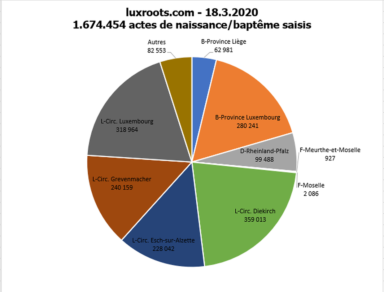Sofern Akten online oder in den Gemeinden oder Pfarreien verfügbar sind, sind alle Details der Geburts-/Taufurkunden des Großherzogtums Luxemburg für den Zeitraum 1601 bis 1923 (99,99%) in unsere Datenbank eingetragen.