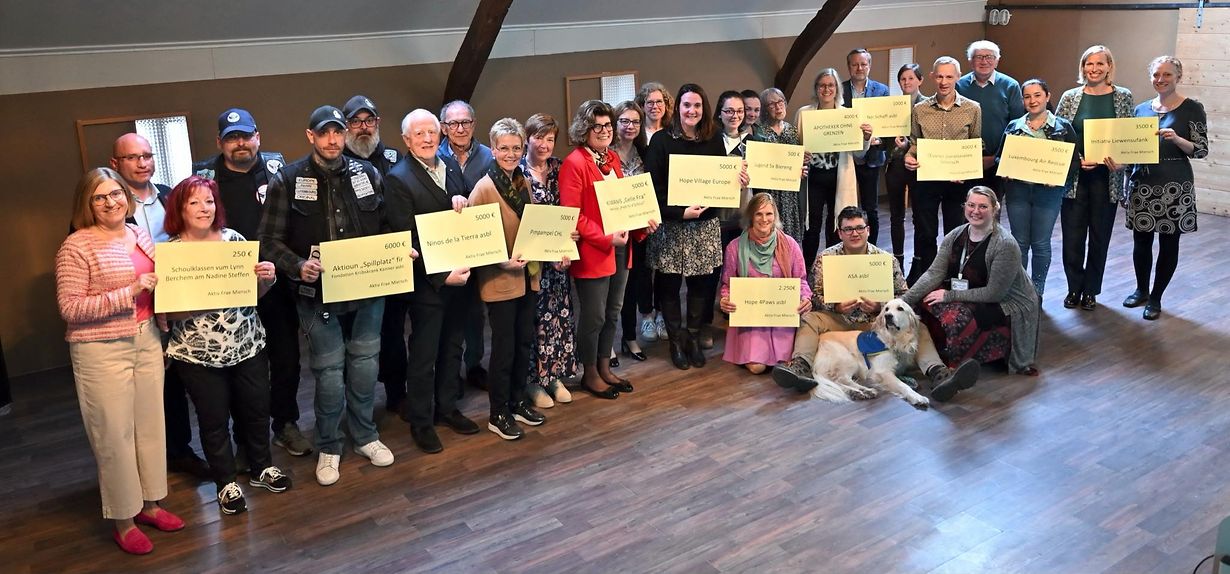 Miersch. Eng Rekord Zomm vun 50.000 Euro, déi den Erléis vum Second Hand Verkaaf, Ugangs Mäerz an der Hal Irbicht zu Biereng duerstellt, konnten "d'Aktiv Frae Miersch" viru kuerzem spenden. 6.000 Euro goungen un d'Aktioun "Eng Spillplaz fir een Häerz fir kriibskrank Kanner, 5.000 Euro un "Hope Village Europe", 5.000 Euro un "Kiwanis Gelle Fra" , 5.000 Euro un "ASA asbl", 5.000 Euro un d'Vereenegung "Pimpampel", 3,500 Euro un "d'Initiativ Liewensufank, 5.000 Euro un Vereenegung "Ninos de la Tierra", 1.000 Euro un "Eng nei Schaff", 4.000 Euro un "d'Oeuvres Paroissiales Miersch", 500 Euro un Jugend vun der Spillerequipe 5 X Biereng, 250 Euro fir Schoulkanner vum C3.1 vu Lorentzweiler, 2.250 Euro un d'Organisatioun "Hope 4 Paws", 3.500 Euro fir "Air Rescue" a 4.000 Euro fir "Apotheker ohne Grenzen". Nodeems d'Presidentin deene villen bénévolen Damen an Hären Merci gesoot huet, déi duerch hir vill Hellef zum Erfolleg bäigedroen hun, ass den Owend mat engem Merci Iessen gemiitlech ausklenge gelooss gin. S.H. (Foto: Charel Reiser) Aktiv Frae Miersch