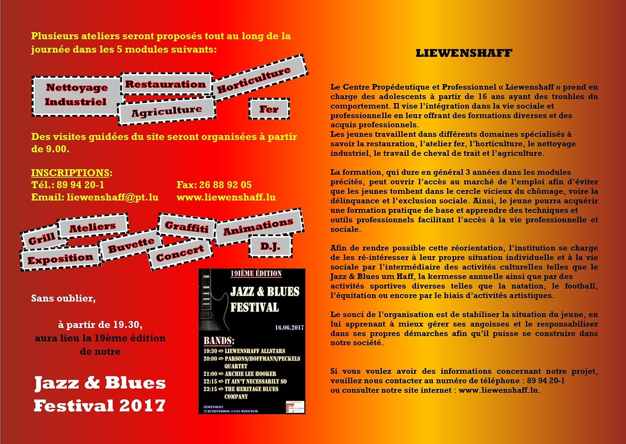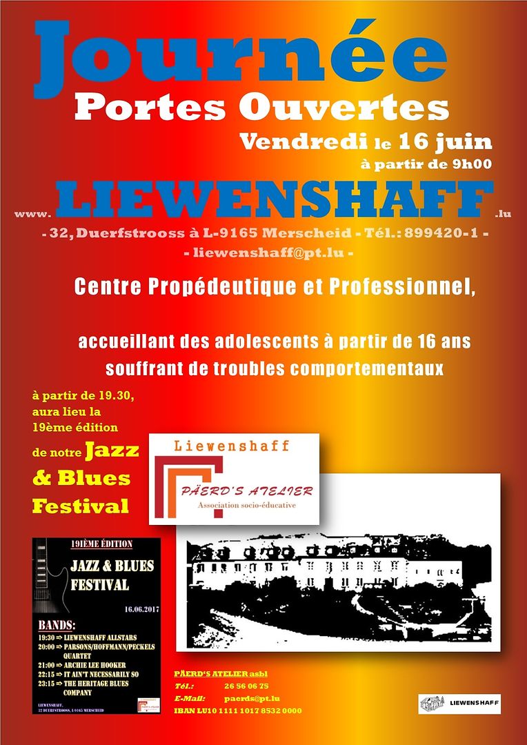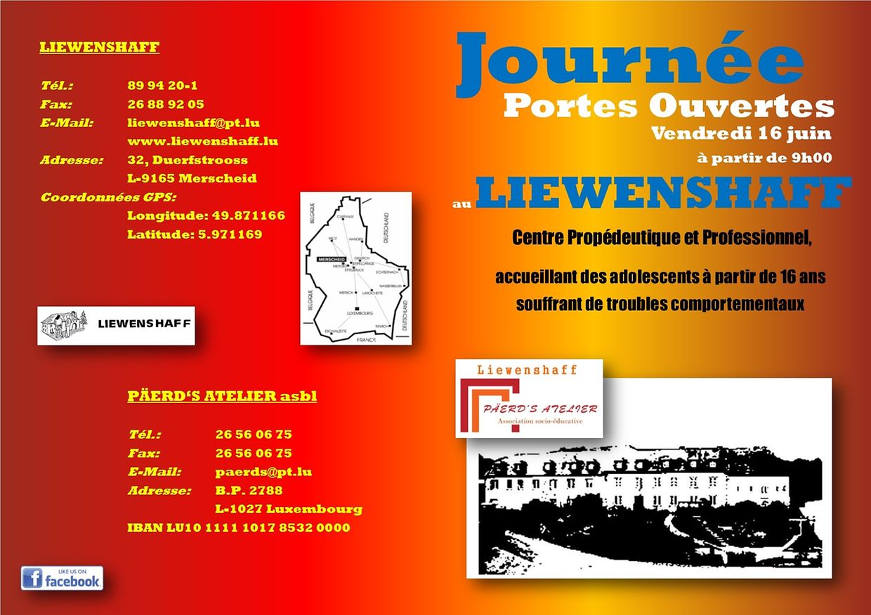 Le personnel et les jeunes sont ravis de vous pouvoir accueillir vendredi, le 16 juin 2017 à 9:00 pour leur Journée Portes Ouvertes. Pour plus d´informations : Tél.: 89 94 20-1 et 26 56 06 75, Fax: 26 88 92 05 et 26 56 06 75, Email: liewenshaff@pt.lu, paerds@pt.lu, homepage: www.liewenshaff.lu