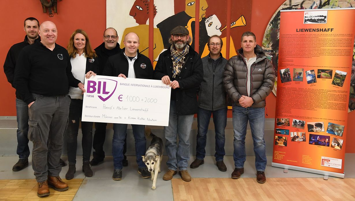 Bereits zum fünften Mal hatten die „Kirmeskicker Noutem“ im September vergangenen Jahres anlässlich der Kirmesfeierlichkeiten in Nothum zum Kirmeskick eingeladen. Dabei organisierten die „Kirmeskicker“ Turniere rund um den Fußball und die „Männer vum Séi“ sorgten für das leibliche Wohl. Auf diese Weise kamen 2 000 Euro von Seiten der „Kirmeskicker Noutem“ und weitere 1 000 Euro von den „Männer vum Séi“ zusammen. Dieses Geld überreichten die Vertreter beider Vereine neulich an Yves Weisen, Direktionsbeauftragter des von der Asbl „Paerdsatelier“ getragenen „Liewenshaff“ in Merscheid. Seit über 28 Jahren widmet sich dieses propädeutische und arbeitsheranführende Zentrum, dank einer abwechslungsreichen und engagierten sozio- edukativen Betreuung, der Wiedereingliederung verhaltensauffälliger junger Menschen in die Gesellschaft bzw. die berufliche Arbeitswelt. Nach einem interessanten Rundgang durch die verschiedenen Abteilungen, bedankte sich Yves Weisen für die Spende und erklärte, dass dieses Geld zur Finanzierung für angehende Anschaffungen im Bereich der intensiven Edukation für Jugendliche verwendet wird. (TEXT/FOTO: CHARLES REISER)