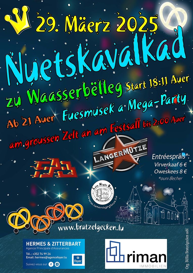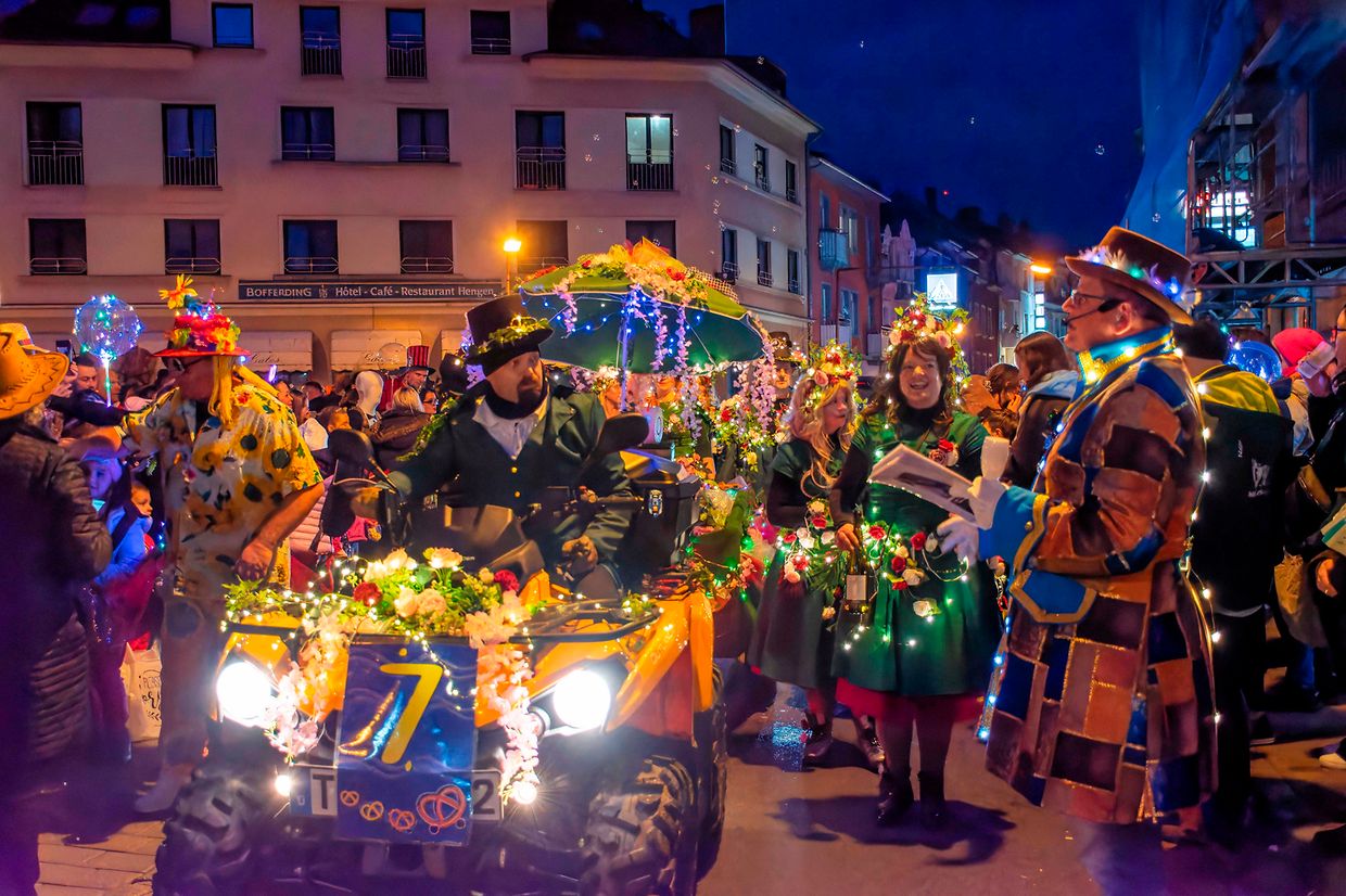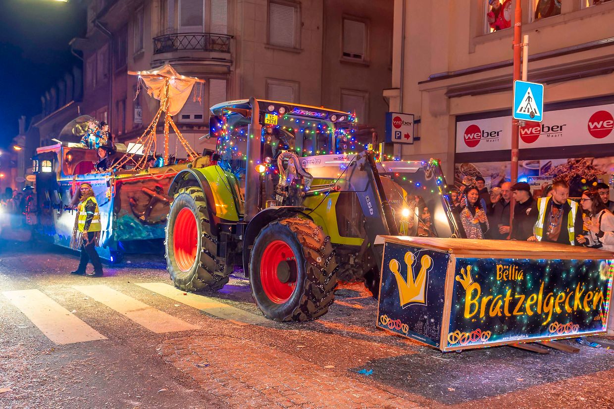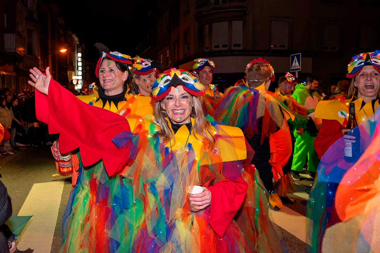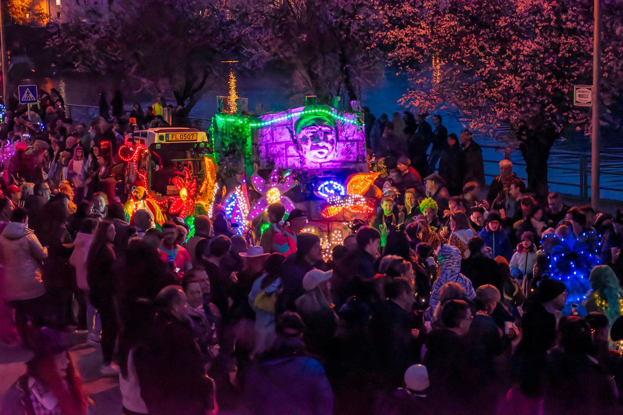 Grouss Nuetskavalkad mat 50 verschiddene Fuesgruppen, vu faarwefroue Fouss- a Museksgruppe bis hin zu konschtvoll beliichte Festwéen an Trakteren.