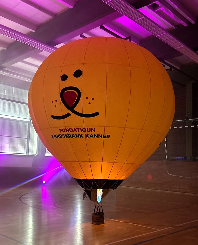 Hire goldgiele Ballon krut 2019 de Logo vun der " Fondatioun Kriibskrank Kanner ", an zenter dem sinn de René a seng Fra Marianne reegelméisseg mam Ballon a mat der Sammelbéchs zu Lëtzebuerg an am Ausland ënnerwee.$