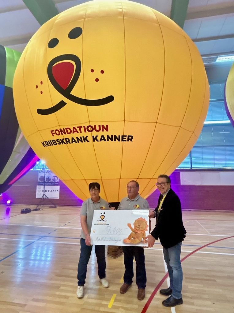 Sou och leschten Sonndeg (25.01.2026) zu Waasserbëlleg an der Sportshal beim Turnéier vun de Modell-Ballon'en a Modellfligeren mat enger flotter Lasershow. Ënnert dem Applaus vun de Spectateuren huet de René METZ an d'Marianne dem Benevole vun der Fondatioun Kriibskrank Kanner e Schéck vu 7000.- iwwerreecht.