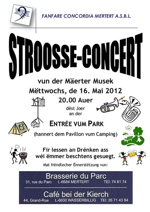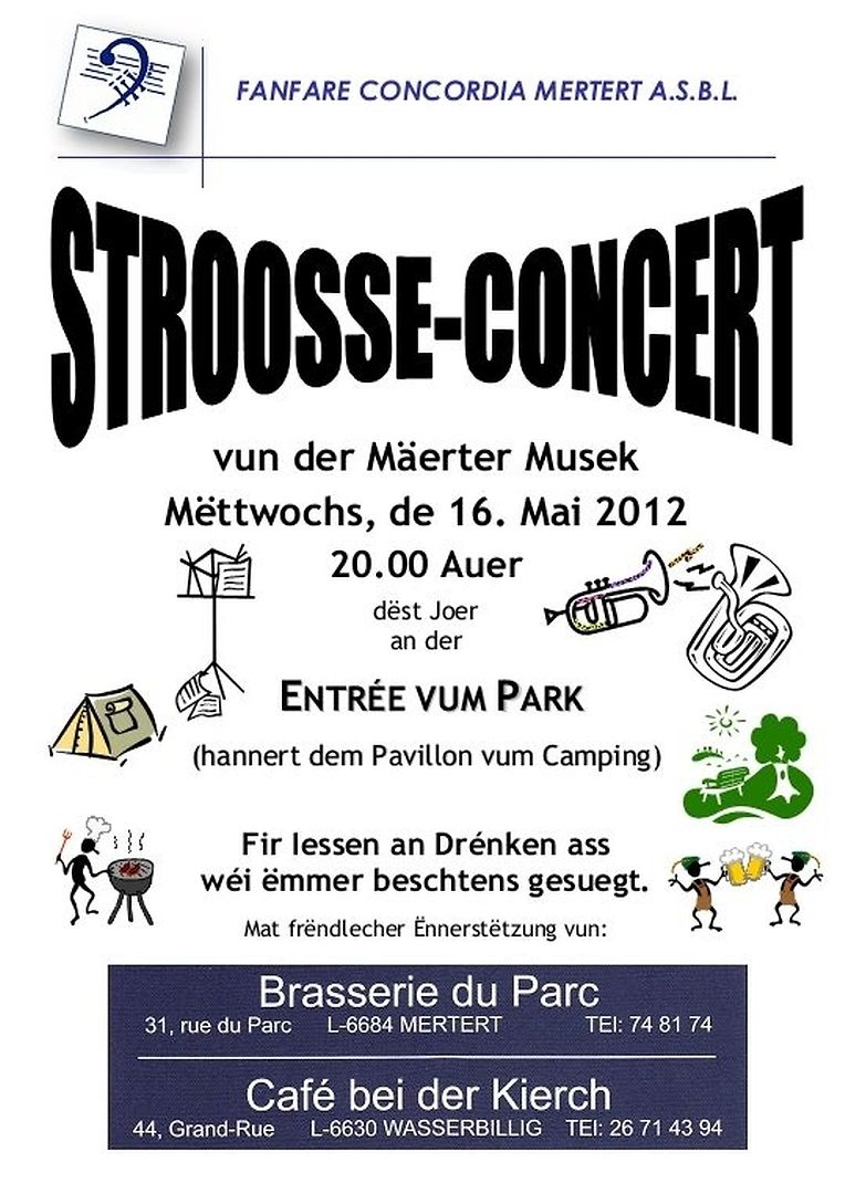 Mertert Stroosseconcert vun der Merter Musek Fanfare Concordia Mertert 2 Bildergalerie Bitte scrollen Sie nach unten,um weitere Bilder zu sehen. Veröffentlicht am Dienstag, 15. Mai 2012 um 01:37 d'Merter Musek spillt hiere Stroosseconcert des Joer an der Entrée vum Park zu Mertert (hannert dem Pavillon vum Merter Camping Stroosseconcert_2012.pdf Unpassenden Inhalt angeben Weitere Neuigkeiten von Fanfare Concordia Mertert > Stroosse-Concert vun der Merter Musik 19.05.11 Mertert