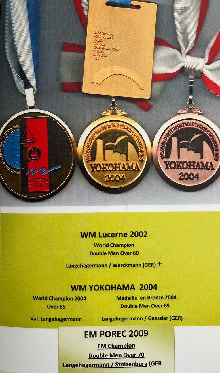 An sengem Palmaresse vun de Veteranen (Alter iwwer 40 Joer) huet de Val international esouvill Titelen a Medailen, sief dat am Bronz, Sëlwer oder Gold kritt, datt et onméiglech ass, déi hei all op ze zielen. Erwänen wëll ech awer hei den Titel vum Vice Weltmeeschter 1984 am Eenzel zu Helsinki, d‘Sëlwer Medaile am Dubbel zu Vancouver am Joer 2000, de Weltmeeschtertitel 2002 am Dubbel zu Luzern bei der Alterskategorie iwwer 60 Joer, an den „ Tëppel um I „ war de „Champion du Monde 2004“ am Simpel iwwer 65 Joer a Japan zu Yokohama.