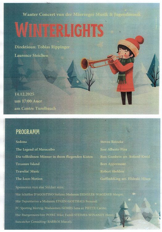 Mertzig Wanterconcert 14 Dez 14 Dez Mehr 14 Dez Norbert Freymann Veröffentlicht am Dienstag, 2. Dezember 2025 um 13:38 Mertzig, Luxemburg Unpassenden Inhalt angeben Weitere Neuigkeiten von Norbert Freymann > Winterlights-Concert 24.12.23 Mertzig Galakonzert 30.04.23 Mertzig Auditioun mit Diplomüberreichung in Mertzig 10.04.23 Mertzig Sonnenënnergang den 10.02.2023 vun der Gewaan Driescht aus geknipst 12.02.23 Mamer Galakonzert in Mertzig 06.05.22 Mertzig