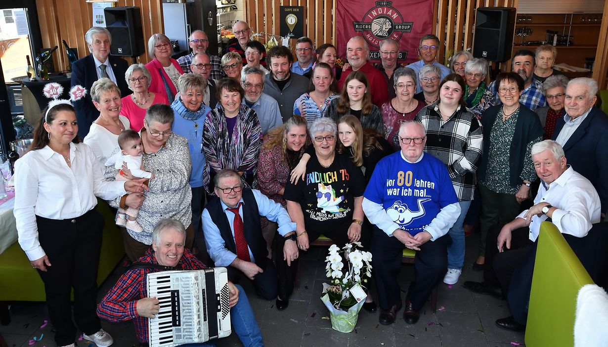 Mäerzeg: Am Krees vun hirer Famill, Frënn a Bekannten hun d’Jeanny an de Jos Glodt- Ottelé vu Mäerzeg am Restaurant Carpe Diem zesummen 155 Liewensjoere gefeiert. Bei deser schéiner Feier konnt de Jos op säin 80. Gebuertsdag erofkucken. Hien koum den 15. Mäerz 1943 als Jong vum Jean an Suzanne Glodt- Schannes zu Lëtzebuerg op d’Welt. No senger Léiher als Elekriker war de Jos vun 1963 bis 1972 bei der Arbed zu Déifferdeng an duerno bis zu senger Pensioun am Joer 2000 bei Trefilarbed zu Bissen beschäftigt. A senger Fräizäit war de Jos als begeeschterten Pompjeesmann och nach wärend 28 Joer Korpschef vun den Mäerzeger Pompjeeën ganz aktiv. Och seng Fra Jeanny Ottelé konnt zugläich seng 75 Joer feieren. D’Jeanny huet d’Liicht vun der Welt den 22. Mäerz 1948 als Duechter vum Aloyse Ottelé an Maria Eck zu Ettelbréck erblëckt. A sengem aktiven Jugendliewen huet d’Jeanny wärend 5 Joer beim demoligen Aendokter Daman an duerno wärend 12 Joer am Solarium Harpes zu Ettelbréck geschafft. D’Hochzäit vum Jos a Jeanny war den 1. Juni 1968. Aus hirem Bestiednis sin no an no zwou Duechteren an e Jong op d’Welt komm. Haut freet sech d’Famill Glodt- Ottelé op hier 4 Enkelkanner. Bei engem deftigem Menü, Spill a Spass verbonnen mat flotter Danzmusik vum Willy ass desen duebelen Gebuertdag zu Mäerzeg och würdig gefeiert gin. (CR) (Foto: Charel Reiser)
