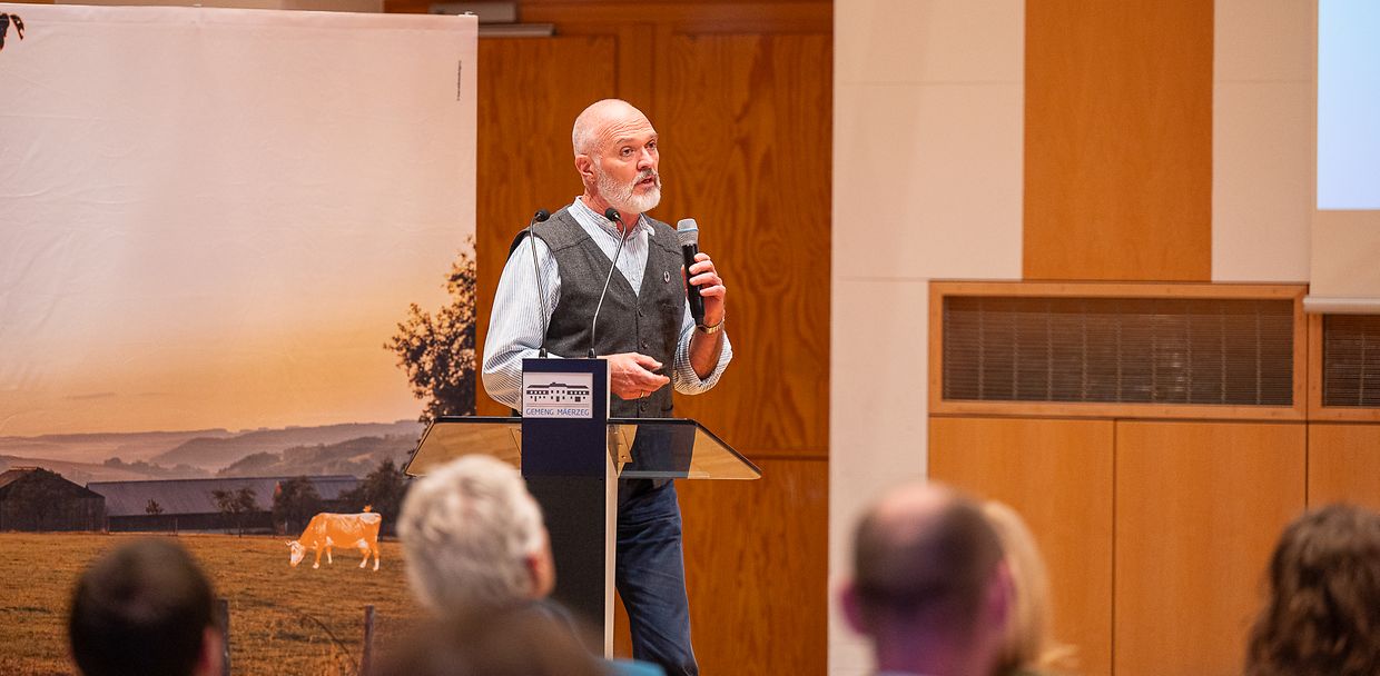 In Zeiten des Klimawandels braucht es für die Landwirtschaft angepasste und neue Wege, um die Nahrungsmittelproduktion gewährleisten und dabei die natürlichen Ressourcen schonend und effizient nutzen zu können. Die Nahrungsmittelversorgung und -souveränität bei steigenden Bevölkerungszahlen steht geradeso im Fokus, wie der nachhaltige Umgang mit unseren begrenzten Ressourcen. Wir haben die planetaren Grenzen einiger Ressourcen bereits erreicht und teilweise schon überschritten. Demnach ist ein „weiter-wie-bisher“ nicht opportun. Wie könnte das Szenario in Luxemburg aussehen? Univ. Prof. Dipl.-Ing Dr. Werner Zollitsch von der BOKU, der Universität für Bodenkultur in Wien, befasst sich mit der Nachhaltigkeit tierischer Produktionssysteme. In seinem Vortrag steckte er den Rahmen ab und beschrieb die „Bio-Tierhaltung in Zeiten multipler Krisen“. Dabei stellte er vier Krisen in den Fokus seiner Betrachtung:
