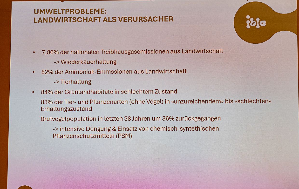 Hier beleuchtete Werner Zollitsch in erster Linie den Punkt der Nahrungskonkurrenz zwischen Mensch und Tier. Wie ist die Relation zwischen Feldfutteranbau für die Tierernährung und damit die Produktion von tierischen Proteinen für die menschliche Ernährung? Z.B. werden in Österreich 52% des Getreides für die Tierfütterung gebraucht, nur 17% gehen direkt in die menschliche Ernährung. Die flächengebundene Rinderhaltung in Kombination mit Weidegang zeigt hier Vorteile und ist noch optimierbar.