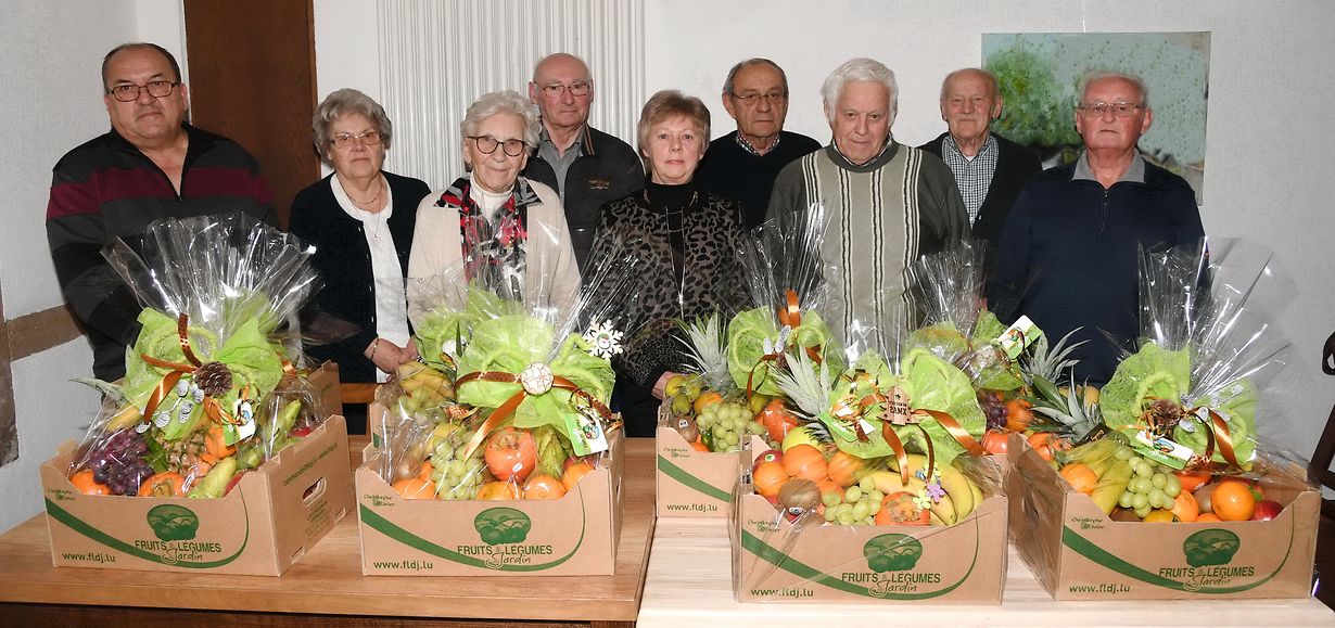 Mertzig: Einer langen Tradition entsprechend nutzten die „ Turelbacher Senioren“ auch dieses Jahr aufs Neue, in der Vorweihnachtszeit die Gelegenheit, im Rahmen ihrer „ Journée du Grand âge“, ihre Jubilaren zu ehren. Im Verlauf des gemeinsamen Mittagessens im Restaurant “ Hennesbau“ in Feulen , bedankte sich Jos Clees , als Vorsitzender der lokalen Seniorenvereinigung aus Mertzig bei allen Mitgliedern für die angenehmen Momente die man im verflossenen Jahr in guter Vereinsatmosphäre gemeinsam verbringen konnte. Nach seinen Glückwünschen an alle Jubilare die im Verlauf des Jahres Geburtstag feiern konnten, wünschte Jos Clees allen Mitgliedern ein frohes Weihnachtsfest sowie ein zufriedenes und gesundes neues Jahr. Danach wurde folgende Geburtstagskinder mit einem prall gefüllten Früchtekorb, gratuliert: für 85 Jahre: Lucien Jacoby und Marianne Majerus- Baulisch. Für 80 Jahre: Hélène Breyer- Steichen, Irma Klapp- Schadecker und Elly Schmitz- Liewerchen. Für 75 Jahre: Jos Clees und Léon Schmitz. Für 70 Jahre: Cécile Koch- Recken. (TEXT/FOTO: CHARLES REISER)