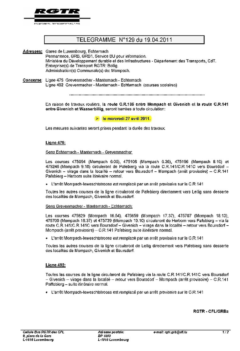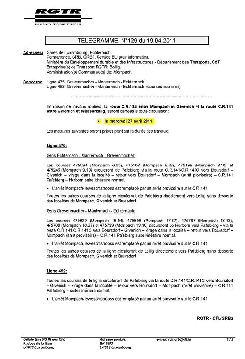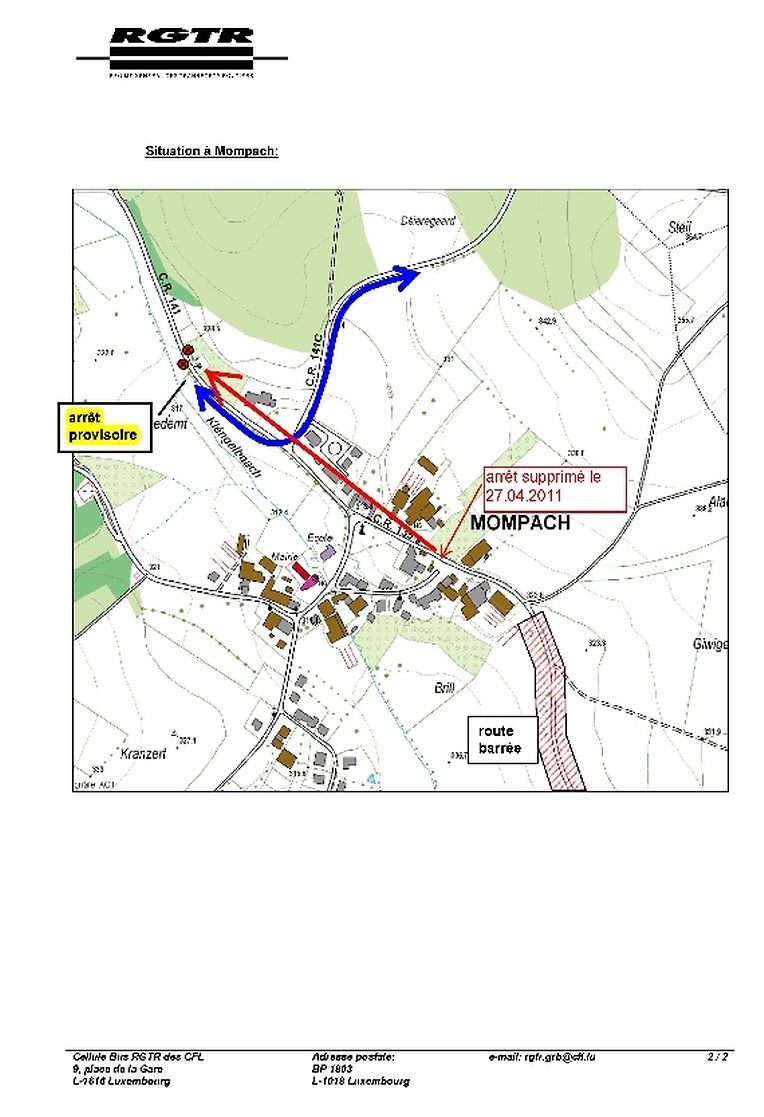 Am 27. April kann die Bushaltestelle "Mompach - Iewschtstrooss" nicht bedient werden, eine provisorische Haltestelle wird auf der neu errichteten Bushaltestelle CR141 (Ausgang Mompach - Richtung Pafebierg) eingerichtet.