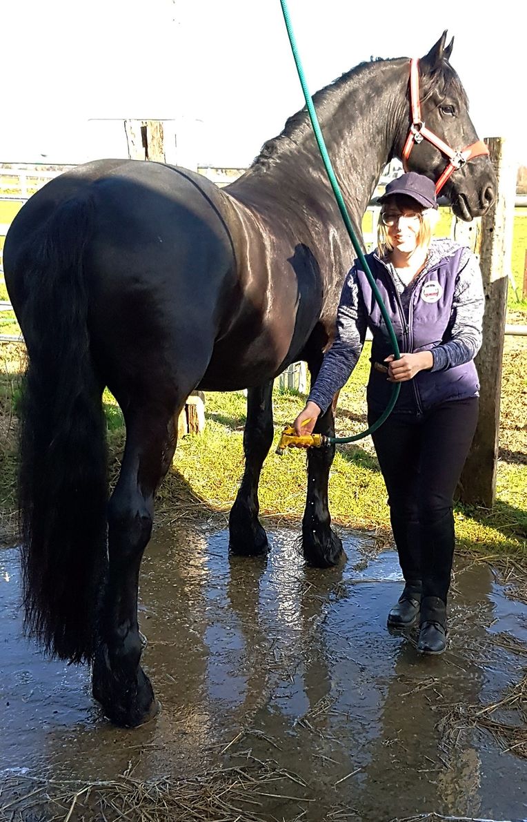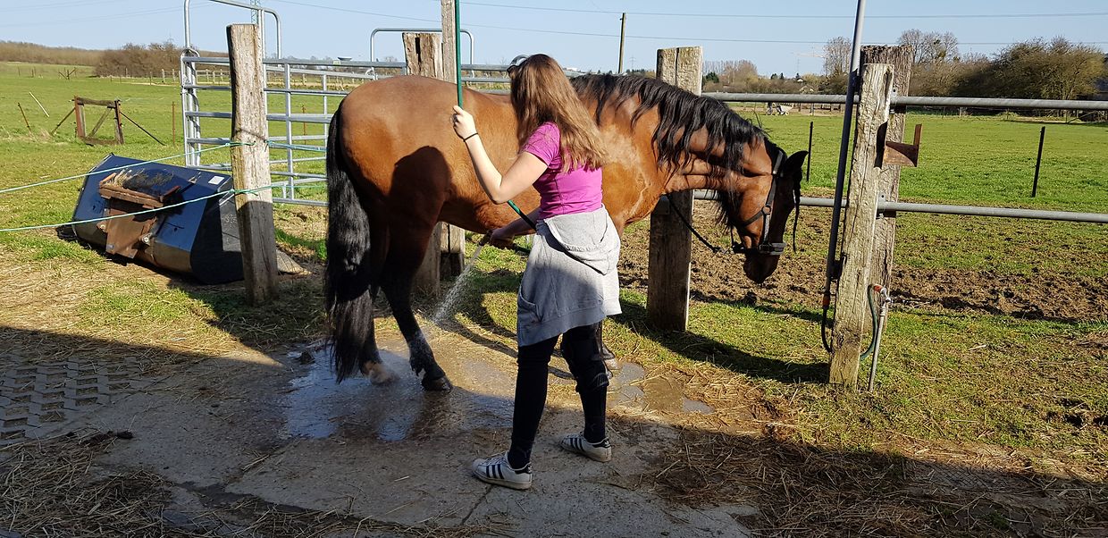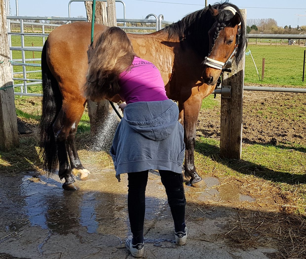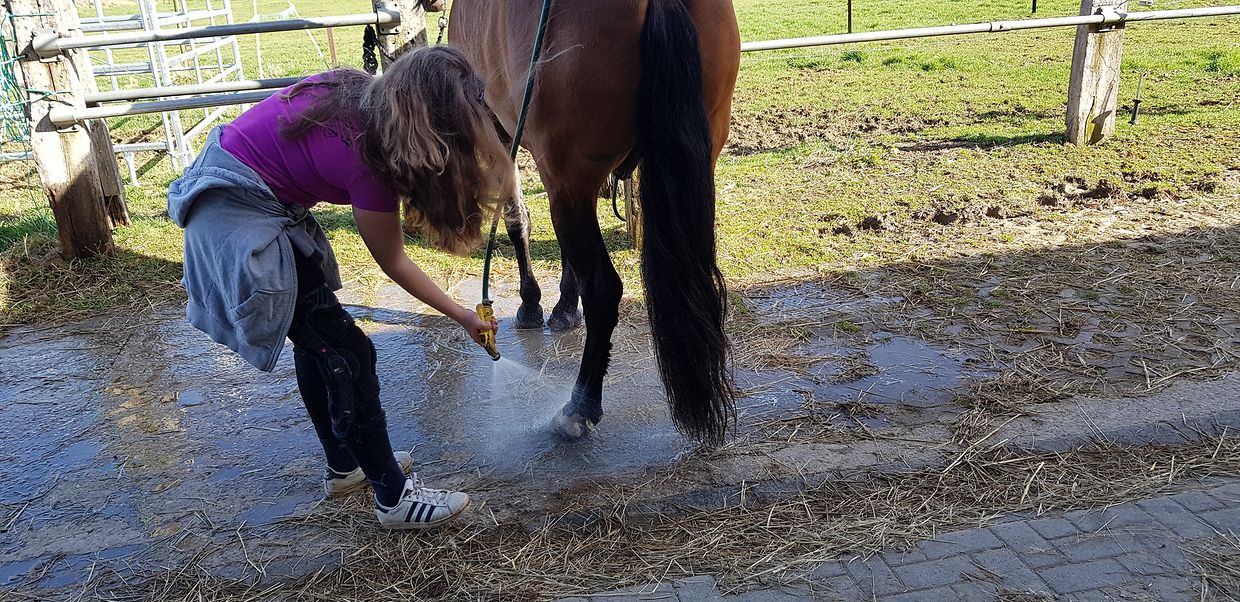 Owes,ginn d’Päerd eragefouert, kréien eng kleng Dusch a duerno hiert Fudder.