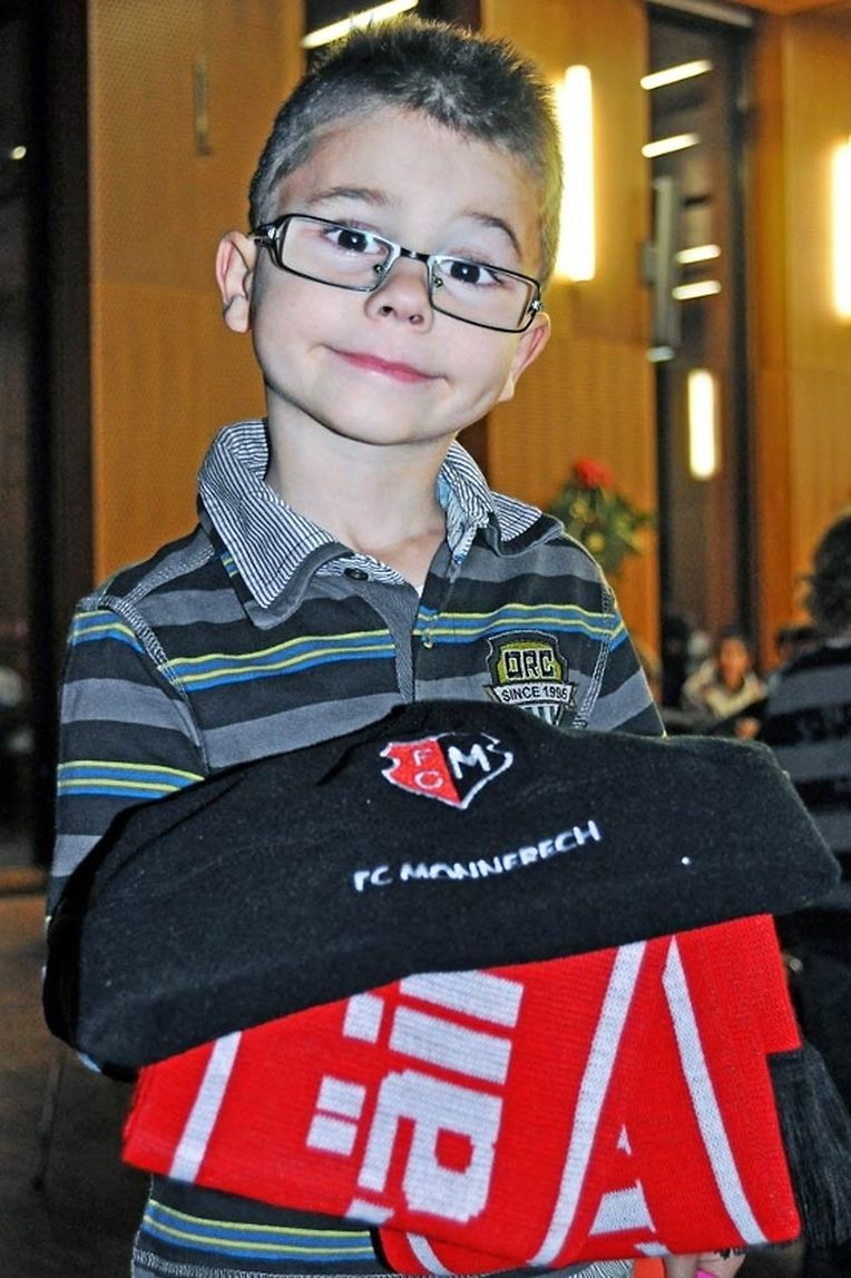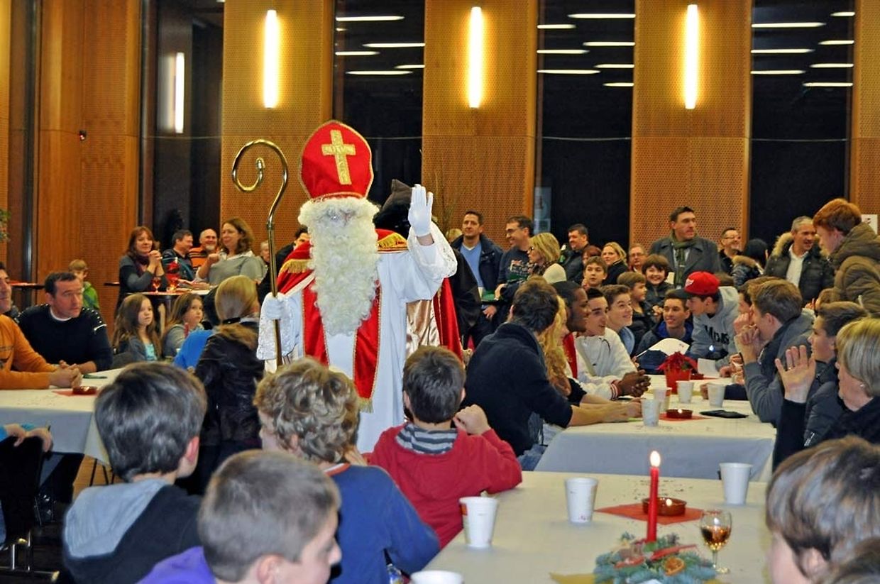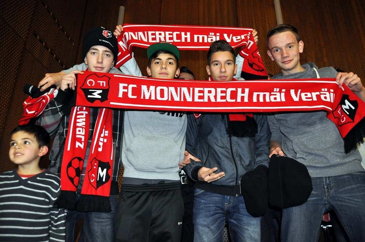 Do war Zäit gutt iwwerbréckt gi well de Kleeschen hat e wéineg Verspéidung. Mee du koum en endlech a Begleedung vun sengem Gesell, den Houseker. Hien huet deene ganz klengen e grousse Luef ausgeschwat fir hier grouss Bereetschaft a Motivatioun déi si un den Dag leeën, fir hier fläisseg Aarbecht a fir déi ganz gutt Leeschtung vun de Bambinis an dëser Saison, déi nach iwwerhaapt kee Match verluer hunn a schonns gutt 130 Goaler am Championnat geschoss hunn. Da sinn Trainer mat hire Meedercher a Jongen op de Podium geruff ginn, Kategorie pro Kategorie, vun de Bambinis bis Juniors! Si hunn all e ganz flotte Cadeau vum Kleesche kritt: eng flott Mutz an e flotte Schal mat neie Slogan vum FC Monnerech "Zesummen een Zil: Rout-Schwarz". Trainer kruten eng Rutt vun deem ellenen Houseker. All Spiller krut doriwwer eraus och nach Bonge fir eng Consommatioun an e Wierschtchen.
