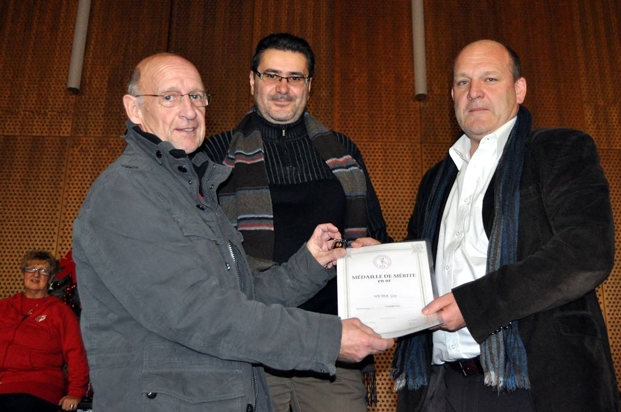 Da koum nach eng flott Iwweraschung. An zwar wousst dee Betraffene guer näischt heivunner. De Guy Weyer ass vum Jupp Biever op de Podium geruff gi wou hien aus den Hänn vum President en Diplom an eng Médaille de Mérite en Or vun der FLF iwwerreecht krut. De Guy Weyer ass näämlech säit 50 Joer an der FLF affiliéiert. Hien ass och vun Ufank un, also säit 1992 an der Jugendkommissioun vum FCM. Hie krut e spezielle Merci ausgeschwat fir all dat wat hie bis elo fir eis Jugend gemaach huet an och fir dat wat hien nach am gaangen ass ze maachen.
