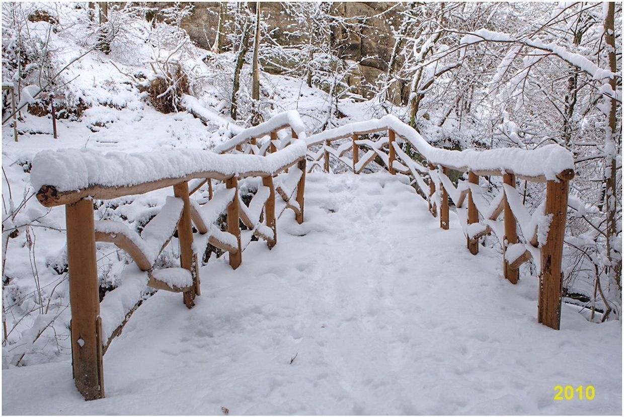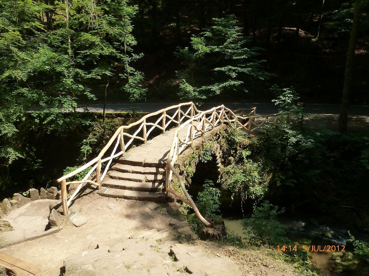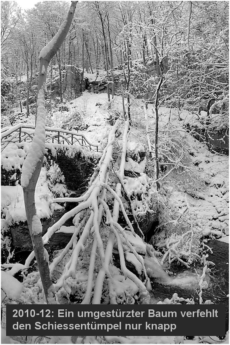 Nun ist der Brückenbau, noch immer der romantischen Umgebung angepasst, bereits 133 Jahre alt. Ist es gestattet sich die Frage nach der Stabilität der Fussgängerbrücke über dem Wasserfall zu stellen? Ohne Mörtel gebaut stellt man bei näherem Anschauen des Brückenbogens verschiedene Steine fest, welche nicht mehr den ursprünglichen Sitz aufweisen! Bisher wurde der Schiessentümpel von umstürzenden Bäumen verschont, der Förster und seine Mannschaft haben beim Entfernen von älteren Bäumen im Umfeld des Schiessentümpel in den vergangenen Monaten gute, aber schwierige Arbeiten ausgeführt, aber es drängt sich die Frage auf, ob die Brücke den Schlag eines umstürzenden Baumes aushalten würde? (FSa)