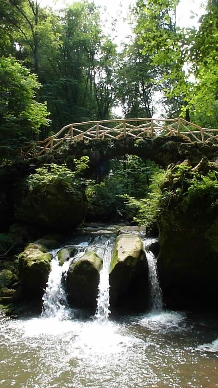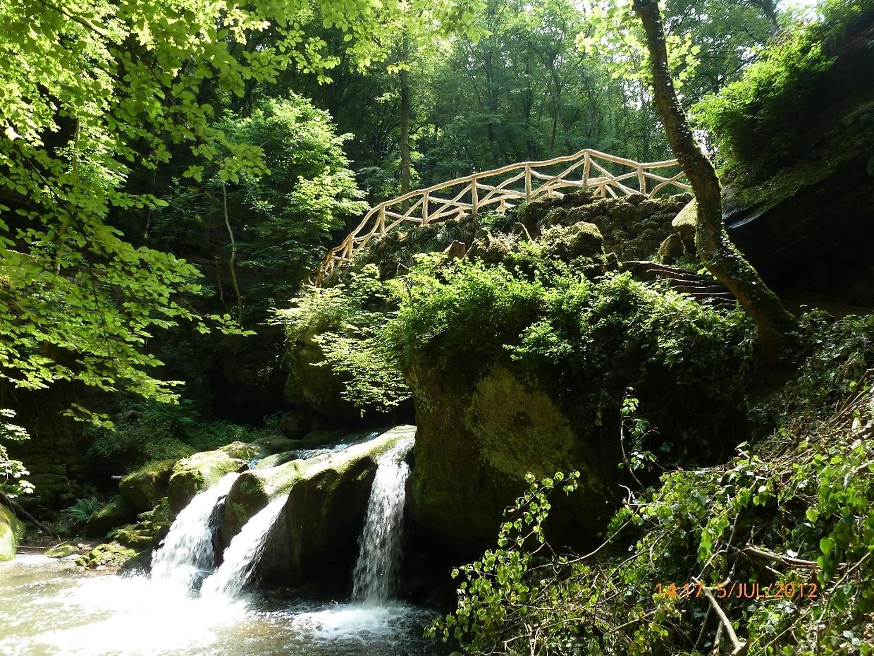 Der Schiessentümpel ist eine viel besuchte und recht bekannte Sehenswürdigkeit des Luxemburger Landes, sozusagen das Wahrzeichen der Region Müllerthal; ein pittoresker Wasserfall an der ´´ Schwarzen Ernz ´´ mit seinen drei Kaskaden, über den sich eine selbst tragende, d.h. ohne Mörtel gebaute Steinbrücke schwingt. Das Wasser der ´´ Schwarzen Ernz ´´schießt in drei Strömen über eine Felskante in ein darunter liegendes Felsbassin, um dann seinen Verlauf in Richtung der Ortschaft Müllerthal fortzusetzen. Mit der idyllischen Brücke aus Stein und Holz, den umliegenden Felsen und der üppigen Vegetation ist der Schiessentümpel zu einem der beliebtesten Ausflugsziele in der Region Müllerthal – Kleine Luxemburger Schweiz geworden.