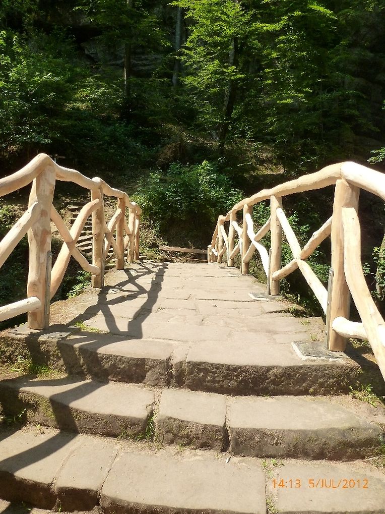 Der Müllerthal Trail und die Rundwanderwege aus Richtung Consdorf und Waldbillig geleiten den Wanderer zum Schiessentümpel, einem handwerklichen Meisterstück, weil es ohne Mörtel gebaut wurde.