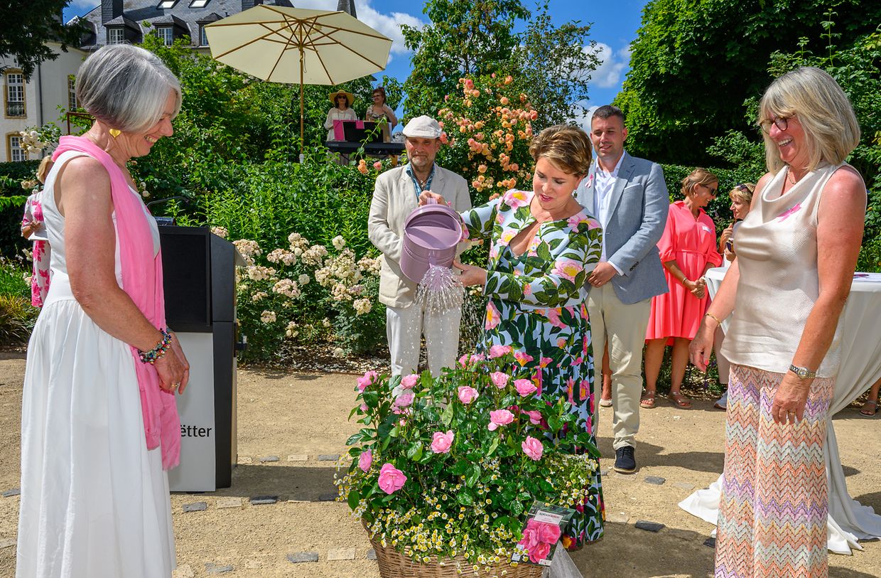 I.K.H. Großherzogin Maria Teresa von Luxemburg betonte anlässlich der Rosentaufe, dass auch ihre Mutter an Brustkrebs verstarb. Sie bedankte sich herzlich bei Europa Donna Luxemburg und den Lëtzebuerger Rousefrënn für ihr Engagement und wünschte der schönen neuen Rose ‚Europa Donna‘ guten Erfolg: „Vive la rose !“ Im Anschluss an die Rosentaufe unternahm sie einen Rundgang durch die Roseraie Château de Munsbach, die 2022 von der World Federation of Rose Societies mit dem „Award of Garden Excellence“ ausgezeichnet wurde und liebevoll von ehrenamtlichen Helfer/innen der Lëtzebuerger Rousefrënn gepflegt wird. In dem öffentlich und kostenfrei zugänglichen Rosengarten sind neben der Rose ‚Europa Donna‘ rund 600 Pflanzen und 160 Rosensorten zu bewundern. Hiervon wurden einige auch auf die Namen von Familienmitgliedern der großherzoglichen Familie getauft. Beim Abschied freute die Großherzogin sich über ein getopftes Exemplar der blühenden Botschafterin gegen den Brustkrebs, das ihr die Lëtzebuerger Rousefrënn überreichten und sie in ihrem Rosengarten auf Schloss Berg einpflanzen lässt.