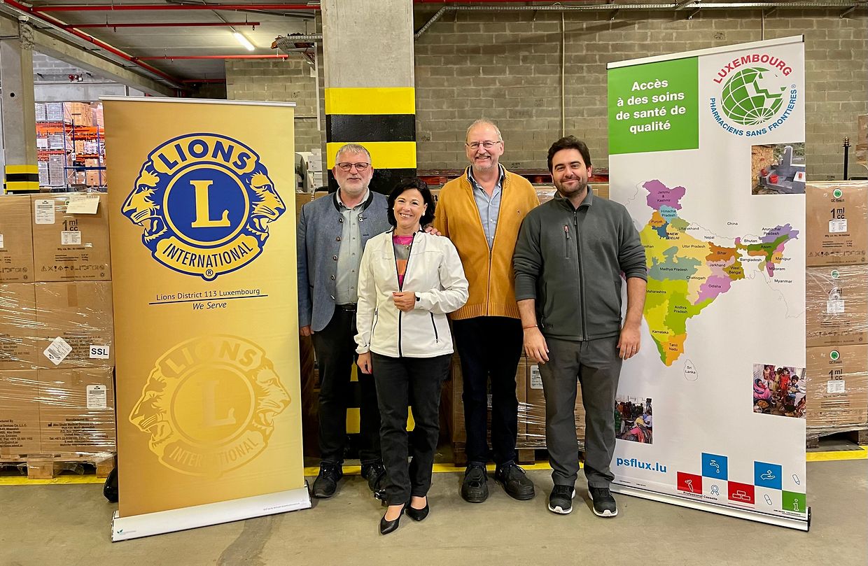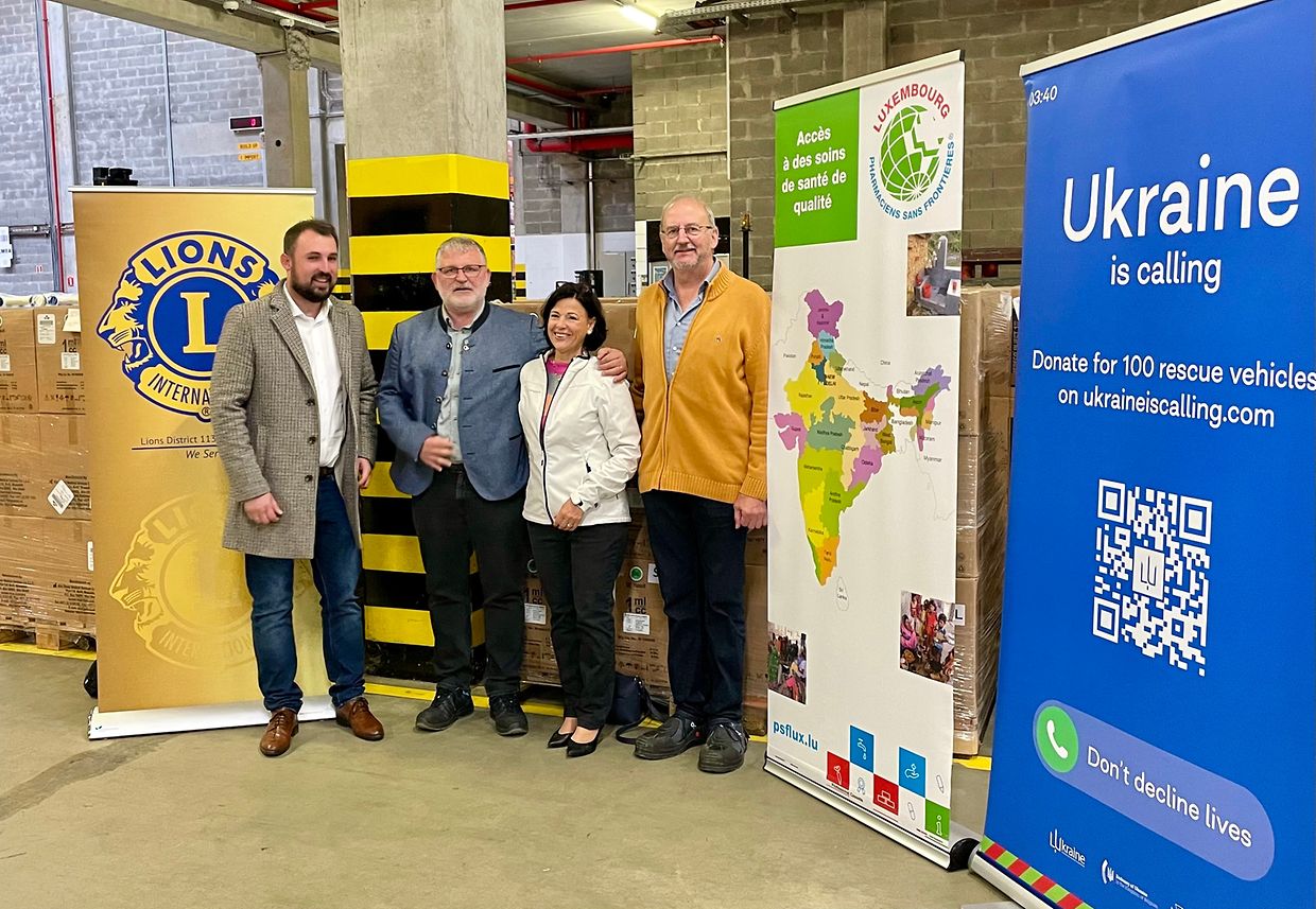 photo 1: de g.à dr. Président de l' LUkraine asbl Nicolas Zharov, Fondation Lions Luxembourg, Stefan Chorus, Marie-France Fassotte, Président Pahrmaciens Sans Frontières Camille Groos, photo 2: à dr. Head of Medlogistics, Romain Labé