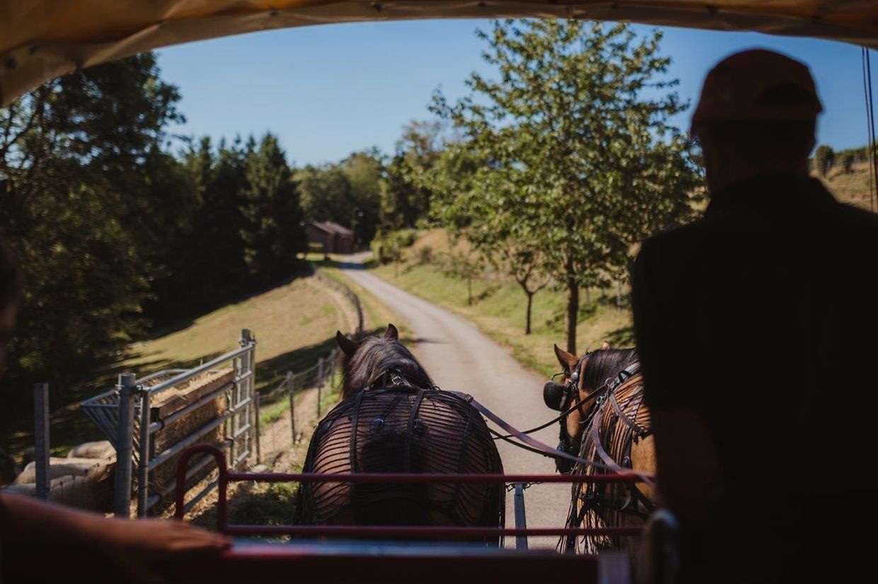 . Tours en calèche : grimpez dans les calèches tirées par nos chevaux de trait pour découvrir le domaine et le village.