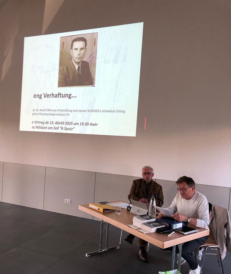 Am schéine Sall "a Sputz" zu Näidsen haten sech en Dasdigowend, op Invitatioun von der Amicale LPL eng 30 Leit afonnt fir eng Konferenz iwwert d'Verhaftung vom Resistenzler Ignace SCHICKES von Draufelt nozelauschteren. No der Begréissung vom Nico THILL, Sekretär von der Amicale LPL, war et um Nico HAMEN fir mat Biller an Texter ze dokumentéieren, wéi d'Resistenzorganisatioun opgebaut war a wat et fir e schwéiere Schlag géint hiert d'Funktionéieren, déi Verhaftung bedeit hott.