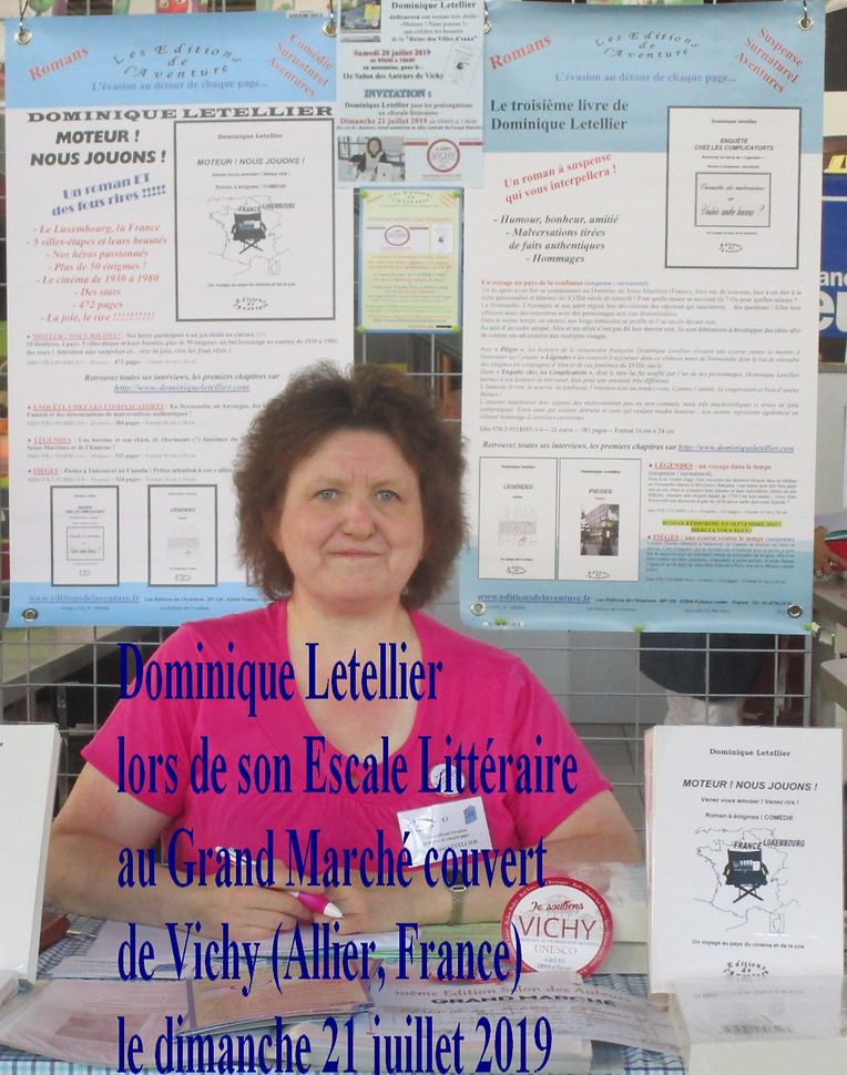 Pendant la manifestation, Dominique Letellier évoquera ses autres romans à suspense : « Légendes » ou quand une héroïne dynamique est l’invitée de fantômes bloqués dans un château en Normandie, « Enquête chez les Complicatorts » au titre faussement léger, qui dénonce des malversations et rend hommage aux journalistes d’investigation, « Pièges » sur le thème de la confiance pour une intrigue au Canada, à Vancouver. Ici, encore, les thèmes favoris de Dominique Letellier sont inclus : les valeurs positives, le courage, l’amitié, l’union, les relations humaines, la psychologie, l’aspect social.