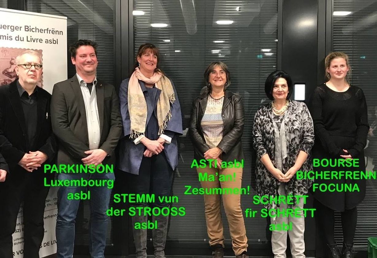 Op hirer Generalversammlung vum 20. März konnten d'Lëtzebuerger Bicherfrënn - Les Amis du Livre asbl 38 000,- € un Don'en ausdeelen un : Parkinson Luxembourg asbl, Stëmm vun der Strooss asbl, Asti asbl, Schrëtt fir Schrëtt asbl an Bourse 'Bicherfrënn' / Focuna.