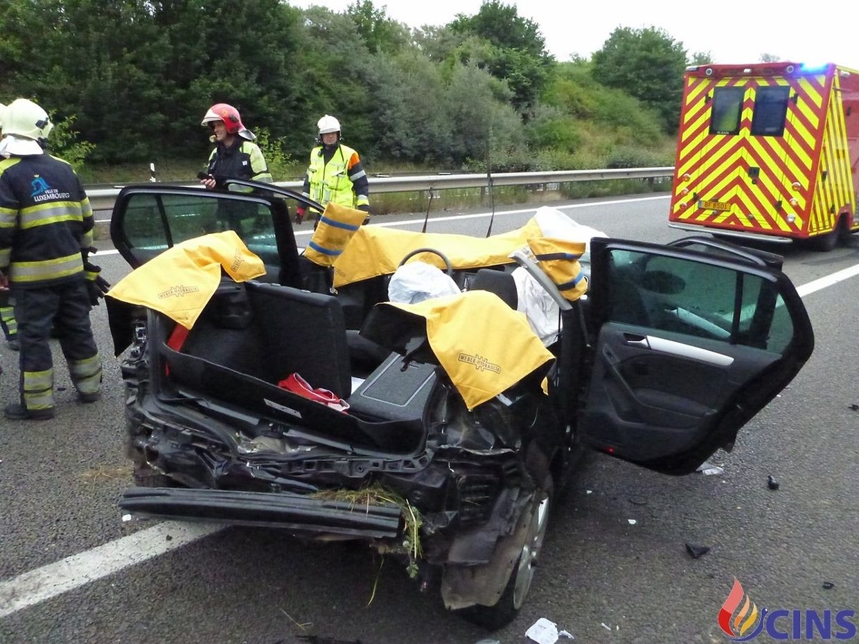 Nach einer Erstversorgung durch den Notarzt aus Luxemburg, musste der Fahrer mittels schwerem hydraulischem Rettungsgerät aus seiner misslichen Lage befreit werden. Der Verletzte wurde anschliessend von der Berufsfeuerwehr Luxemburg ins Hôpital Kirchberg gebracht. Am Wagen entstand Totalschaden. Die Autobahn war während den Rettungsmassnahmen für eine Stunden nur Einspurig befahrbar.