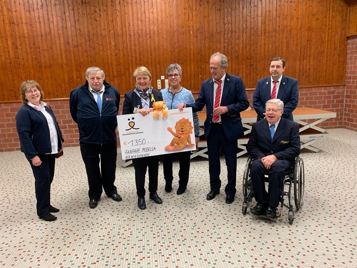 Nom Concert ass eng Quête gemaat gin zu Gonschten vun der Fondatioun Kriibskrank Kanner. Op dem vun der Gemeng Fluessweiler offréierten Eierewäin konnten den Dammen Denise a Josiane als Representanten vun der Fondatioun e Chèque vun 1350 Euro iwwerreecht gin.