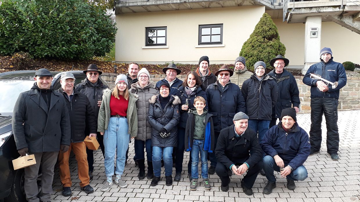 Awunner vun Nidderdonwen den Hämmelsmarsch ze spillen. Den Steve huet si gemittlech mat sengem Trakter vun Haus zu Haus gefouert. Ennerwee waren d'Musikanten och frou iwer di eng oder aaner Méiglechkeet fir sech "vun bannen opzewiermen".