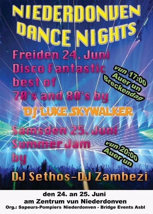 Den 24. an den 25. Juni sin zu Niederdonven am Zentrum d'Niederdonven Dance Nights, dat ganzt am Kader vum 125. Anniversaire vun den Pompjëeen vun Niederdonven.