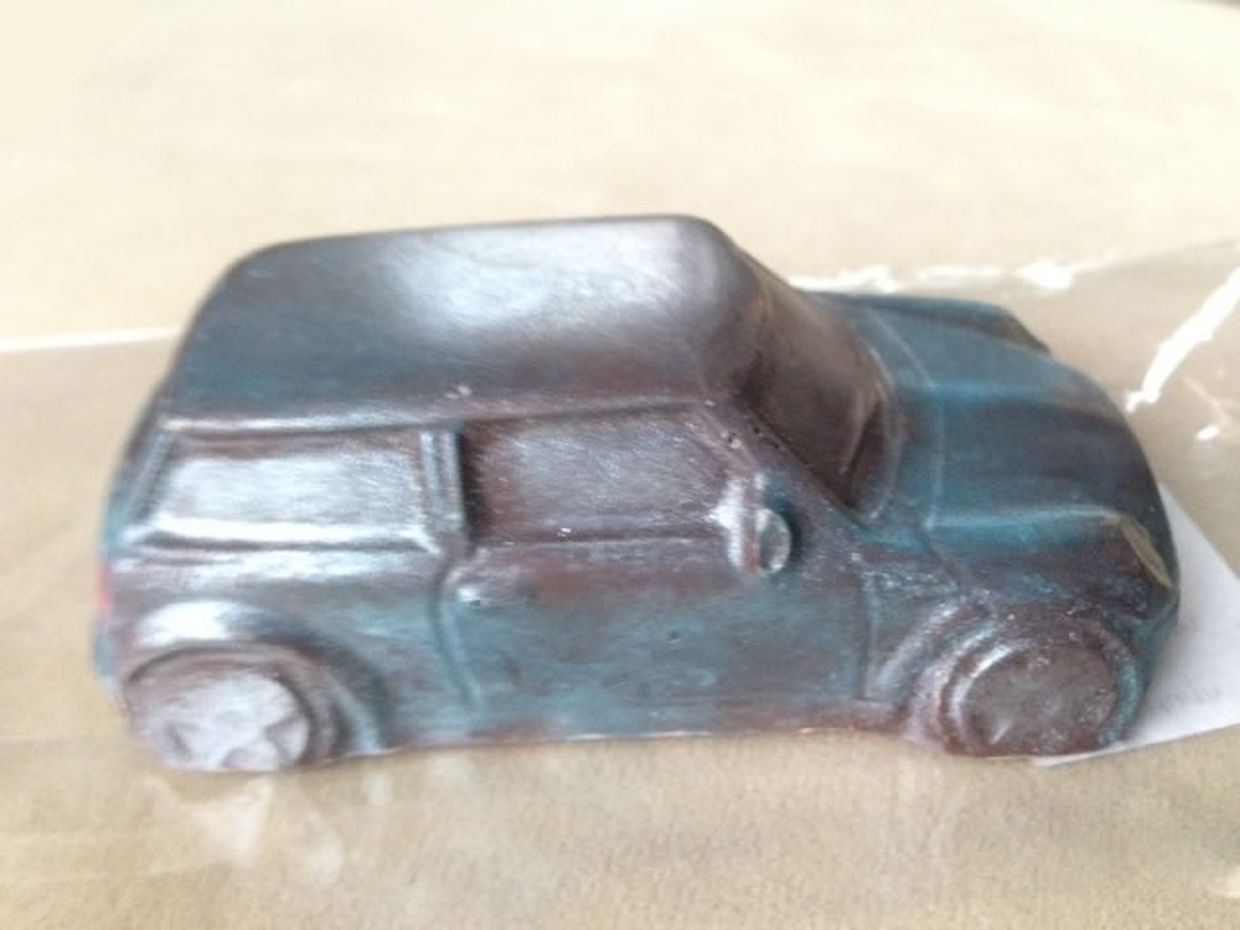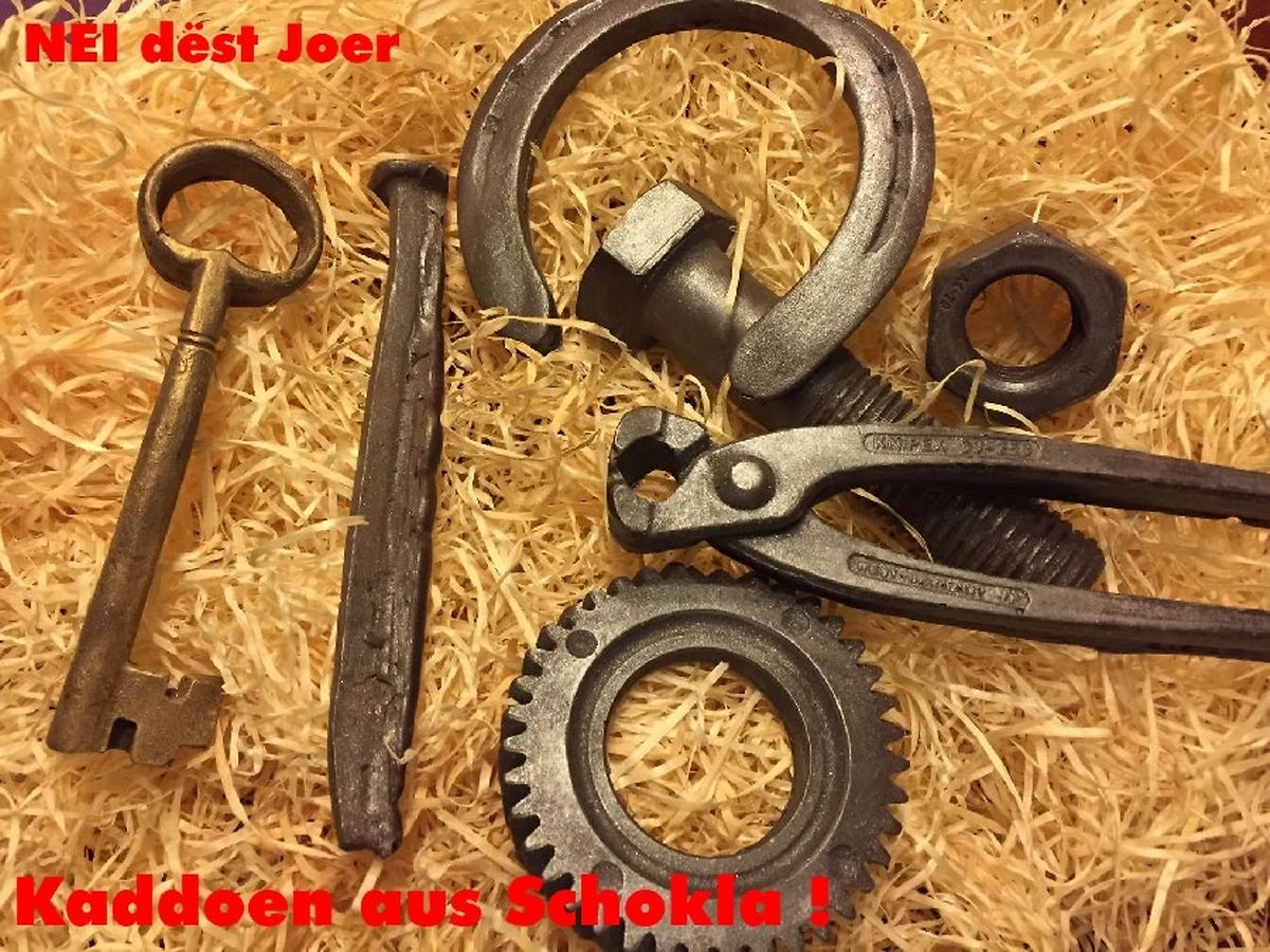 Där sicht nach e flotte Kaddo fir Chrëschtdag ? Da kommt dëse Weekend nach op de Käerjenger Chrëschtmaart op der Cito Platz. Den Handball Käerjeng verkeeft allerhand flott Artikelen am Schockela. Do kritt där Schrauweschlëssel mat der passender Schrauf a Mudder. Oder eng Setzwo, en Hummer oder e Fläschenëffner ?. D'Autofreaks fannen e Mini, e VW Käfer oder e Fiat 500. Alles am Schokla. Ass flott ze kucken, mee schmaacht och gutt.